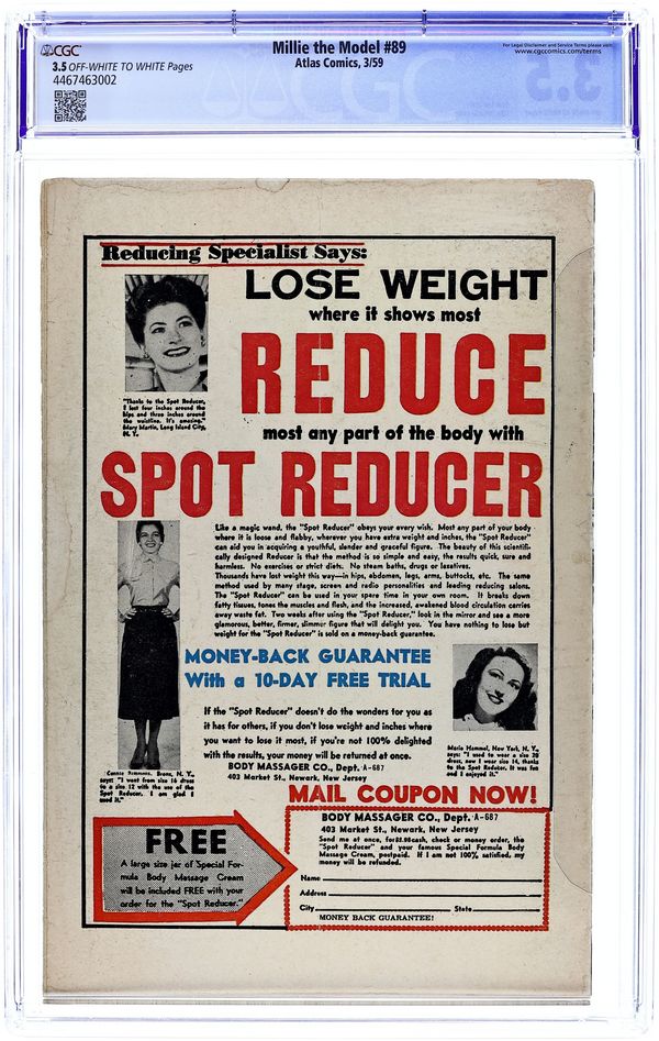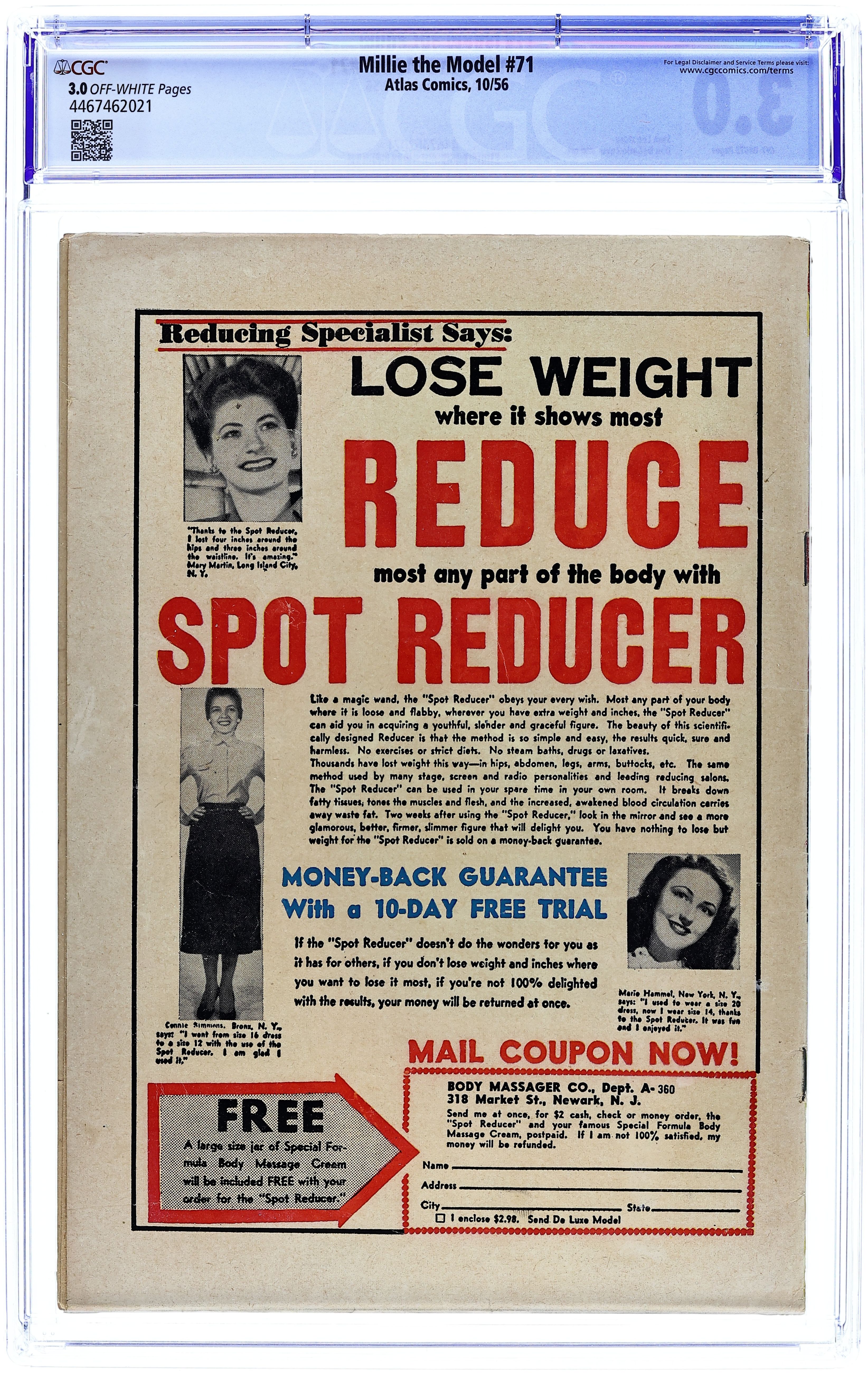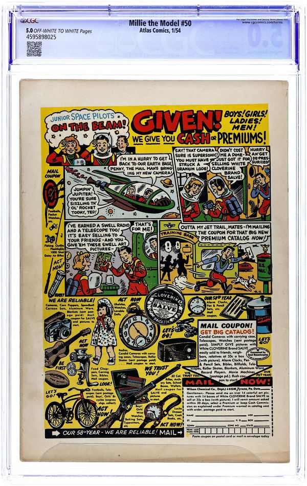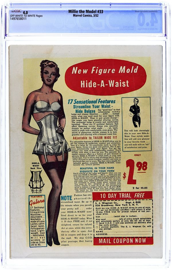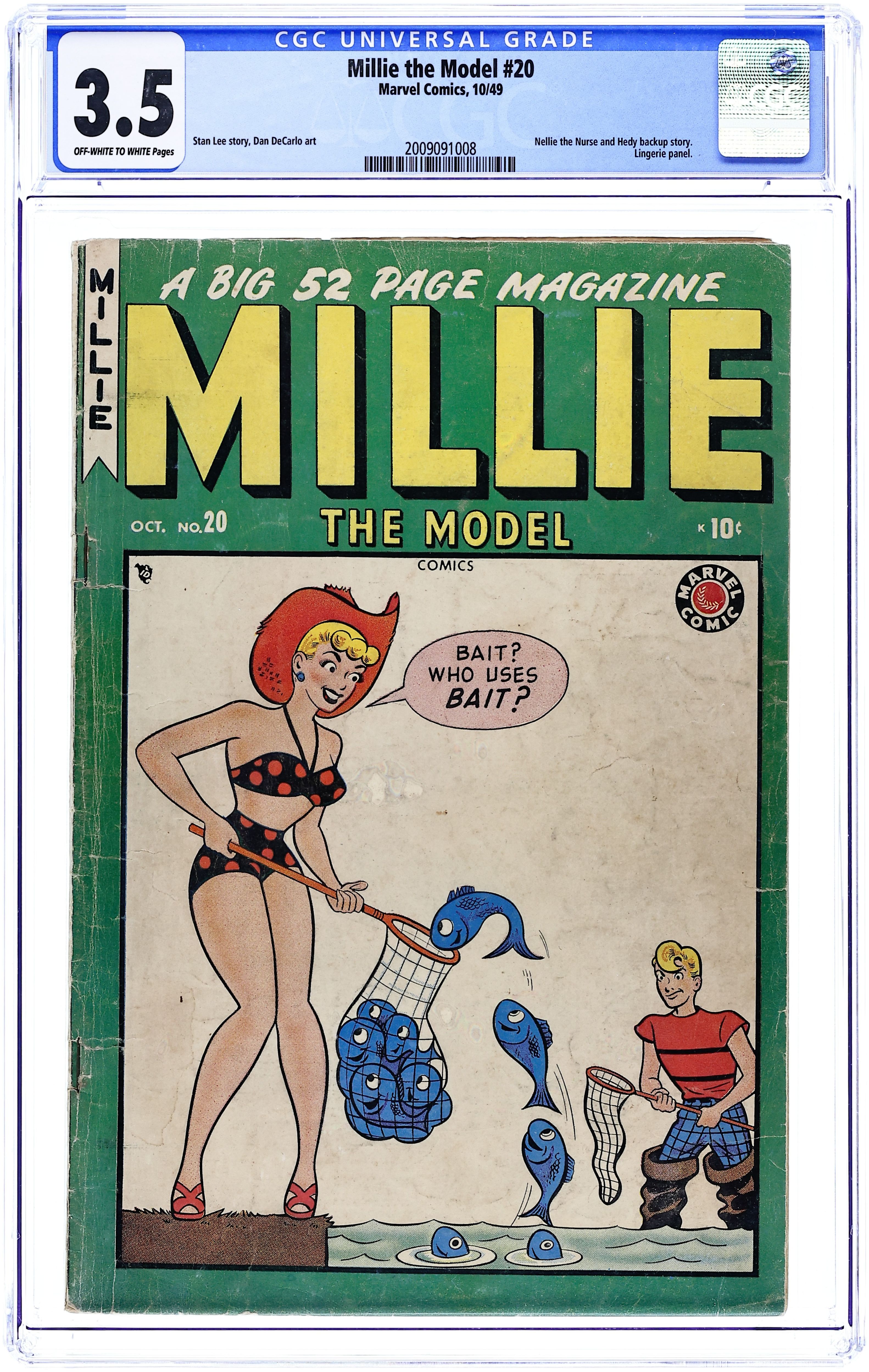 Cover by Dan DeCarlo. Stories by Stan Lee and unknown. Art by Dan DeCarlo and unknown. Millie the Model in four stories by Stan Lee and Dan DeCarlo: "Millie's Spree at Sea!"; "The Bull was No Fool!"; "Up in the Air!"; and "The Bathing Suit Beaut!" Plus: Hedy De Vine in "Mister Bigdeal's Big Deal!"; Nellie the Nurse in "The Mad Rush" by Stan Lee and Dan DeCarlo; and 2-page text story "Platter Hunters," reprinted from Patsy Walker (1945) #20. Also: 1-page "A Letter to Our Readers and their Parents!" in defense of comic books. 48 pages, full color. Cover price $0.10.