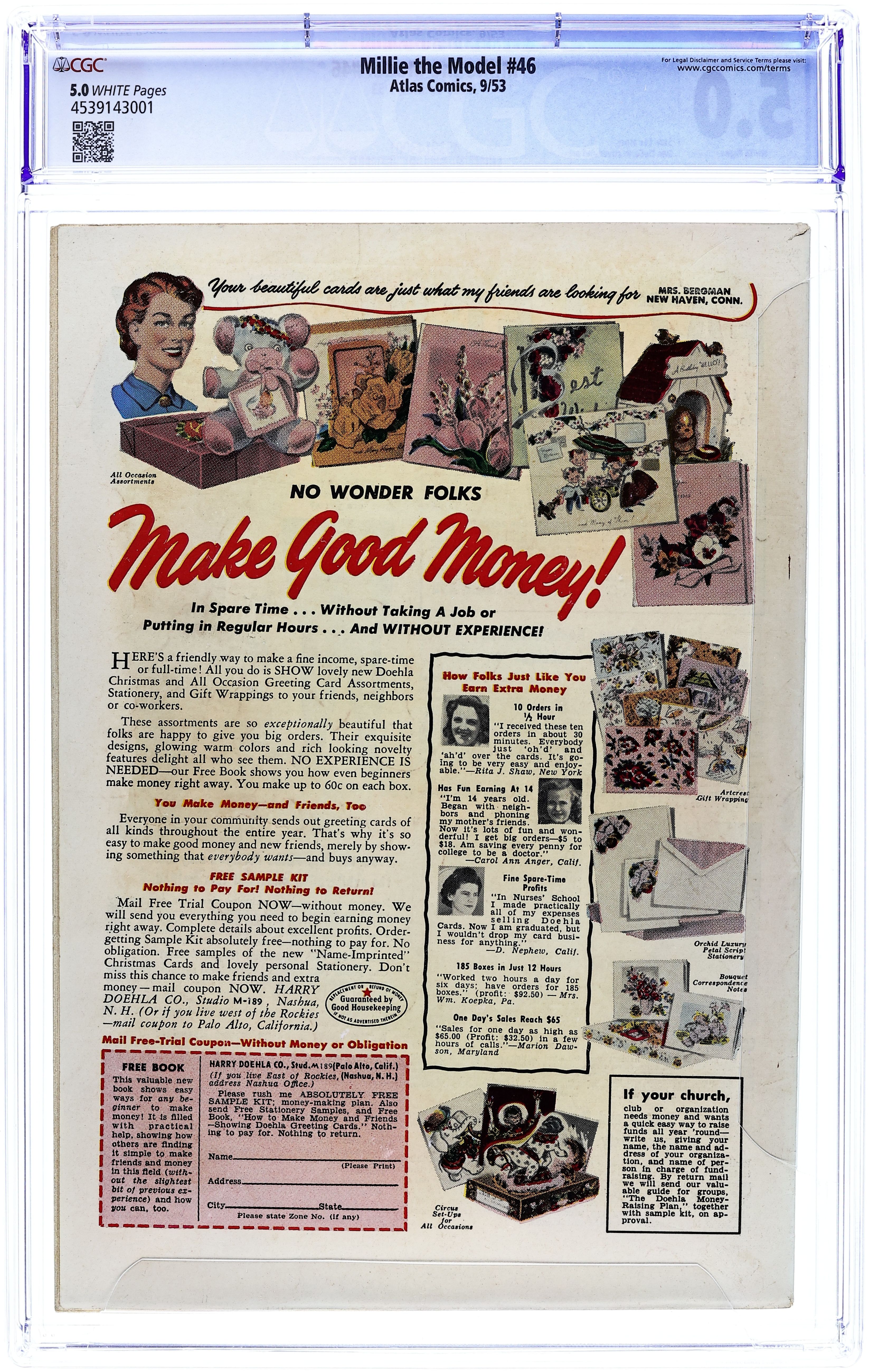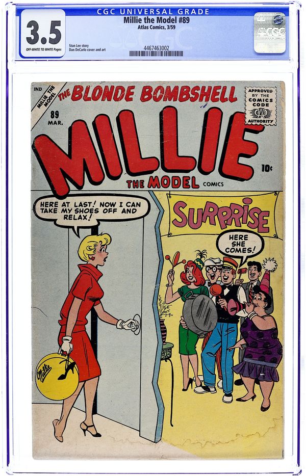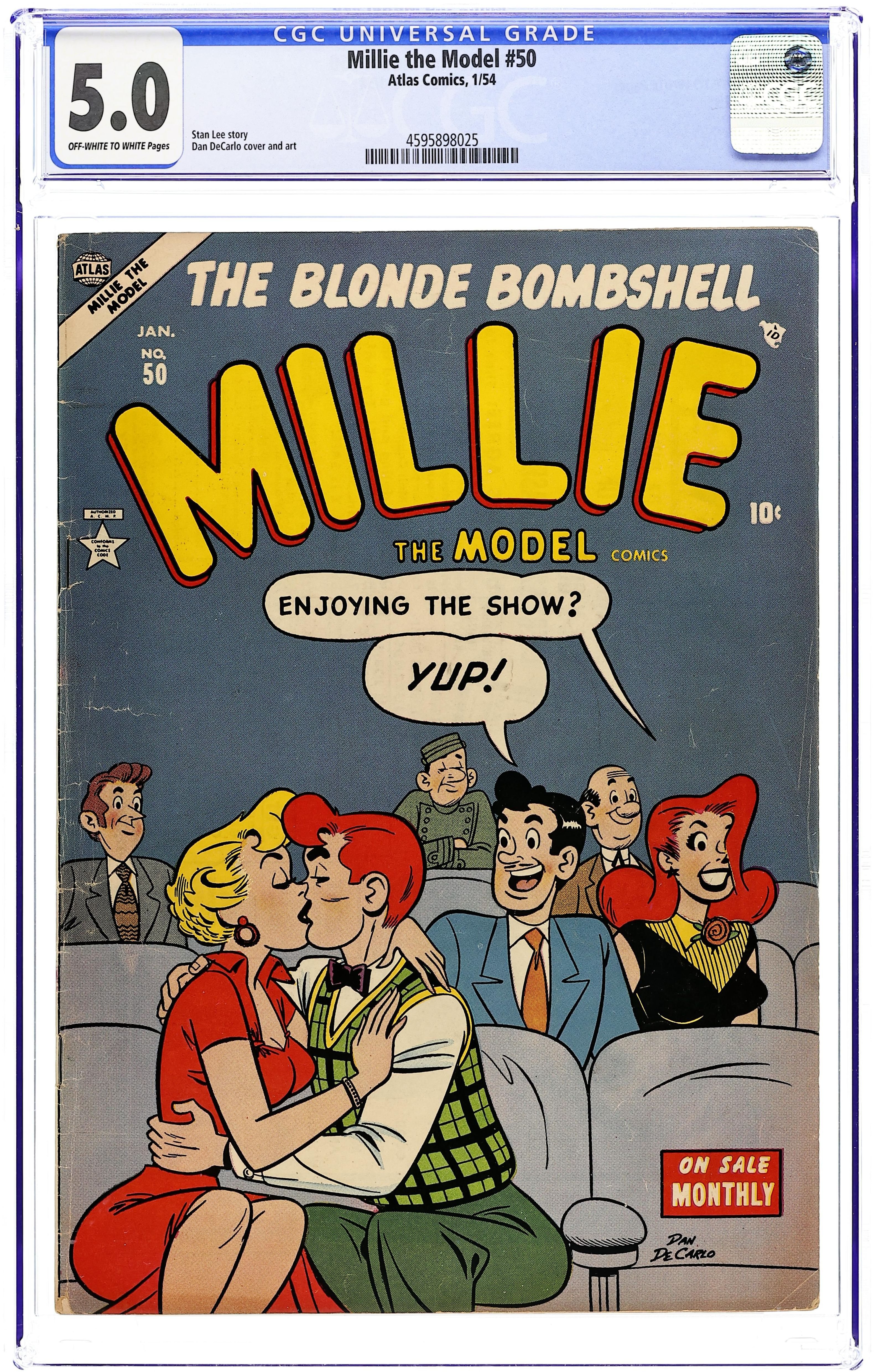 Stories by Stan Lee. Art by Dan DeCarlo, Carl Dorese and unknown. In this issue: Millie the Model in four untitled stories with art by Dan DeCarlo. Plus: untitled Hedy De Vine tale; untitled Nellie the Nurse tale with art by Carl Dorese; and 2-page text story "The Song Hit" (creators unknown), reprinted from Annie Oakley (1948 Atlas) #4. 48 pages, full color. Cover price $0.10.