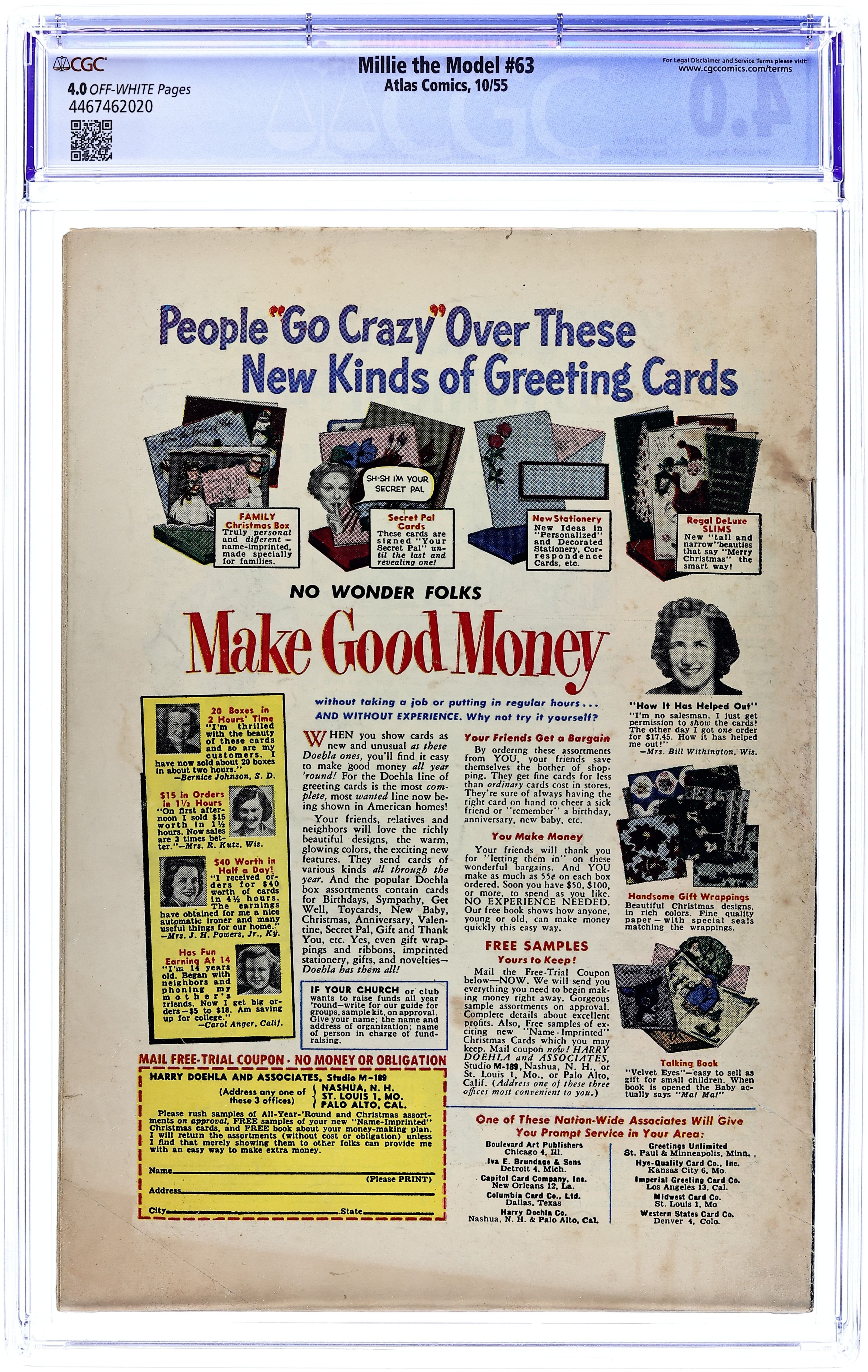Stories by Stan Lee. Art and Cover by Dan DeCarlo. Millie the Model in: two untitled stories; "Millie Models..." 4-pager; three untitled 1-pagers; "Millie's Fashion Page" half-pager; and one untitled half-pager. Plus: 2-page text story "Dream Girl" (creators unknown; different from text stories with same title in #43 and #65); untitled My Girl Pearl story; untitled Chili half-pager; and "Chili's Fashion Page" half-pager. 32 pages, full color. Cover price $0.10.