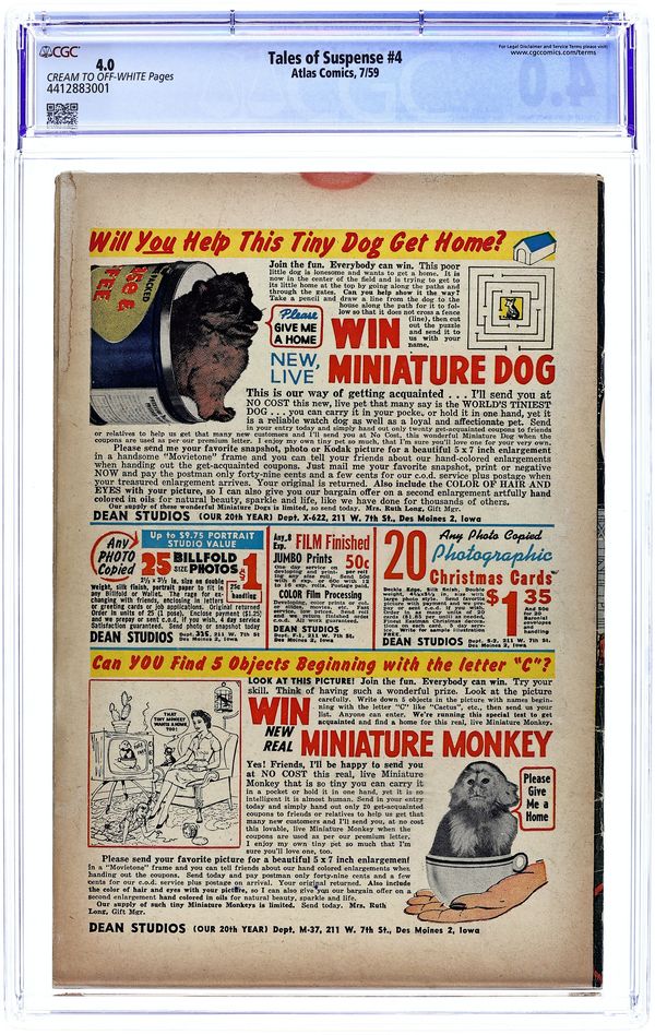 Cover pencils by Jack Kirby, inks by Steve Ditko. "I Found the Girl in the Blue Glass Bottle!", pencils by Jack Kirby, inks by Dick Ayers; A curio shop owner uses an ancient magic bottle to shrink people, but one of his victims turns the magic of the bottle on him and escapes, as the shop owner shrinks to nothing. "Tricky Travel" text story. "The Forbidden World!", pencils by Jack Kirby, inks by Dick Ayers; A space patrol find an alien world surrounded by a strange mist. "The Coming of the Giants!", art by Don Heck; The humanity of the near future grow proud as they approach space travel, but when alien giants arrive they are only saved from conquest because they are too tiny to notice. "Who Am I?", script by Stan Lee, art by Steve Ditko; A man finds himself lost in a fog with no idea who he is; He is approached by a stranger who offers to help him through hypnosis; The hypnosis recovers his lost memory and he realizes that he was a circus performer who has died from a fall from the high wire. 36 pgs., full color. $0.12. Cover price $0.12.