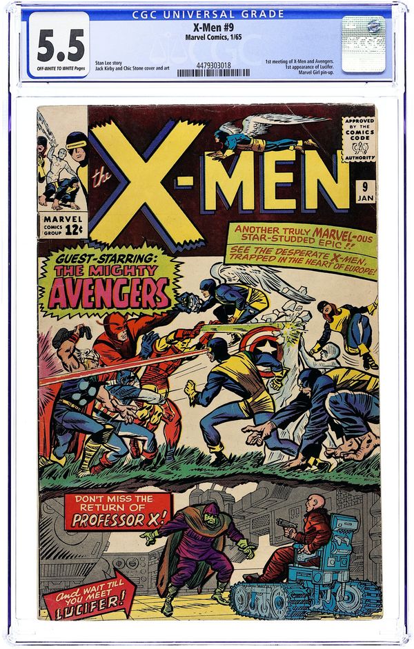 "Enter, The Avengers!" Script by Stan Lee, pencils and cover by Jack Kirby with inks by Chic Stone. 1st meeting of X-Men and the Avengers, 1st appearance of Lucifer. Also features a Marvel Girl "Marvel Masterwork" pin-up with pencils by Kirby and inks by Chic Stone. 36 pgs. Cover price $0.12.