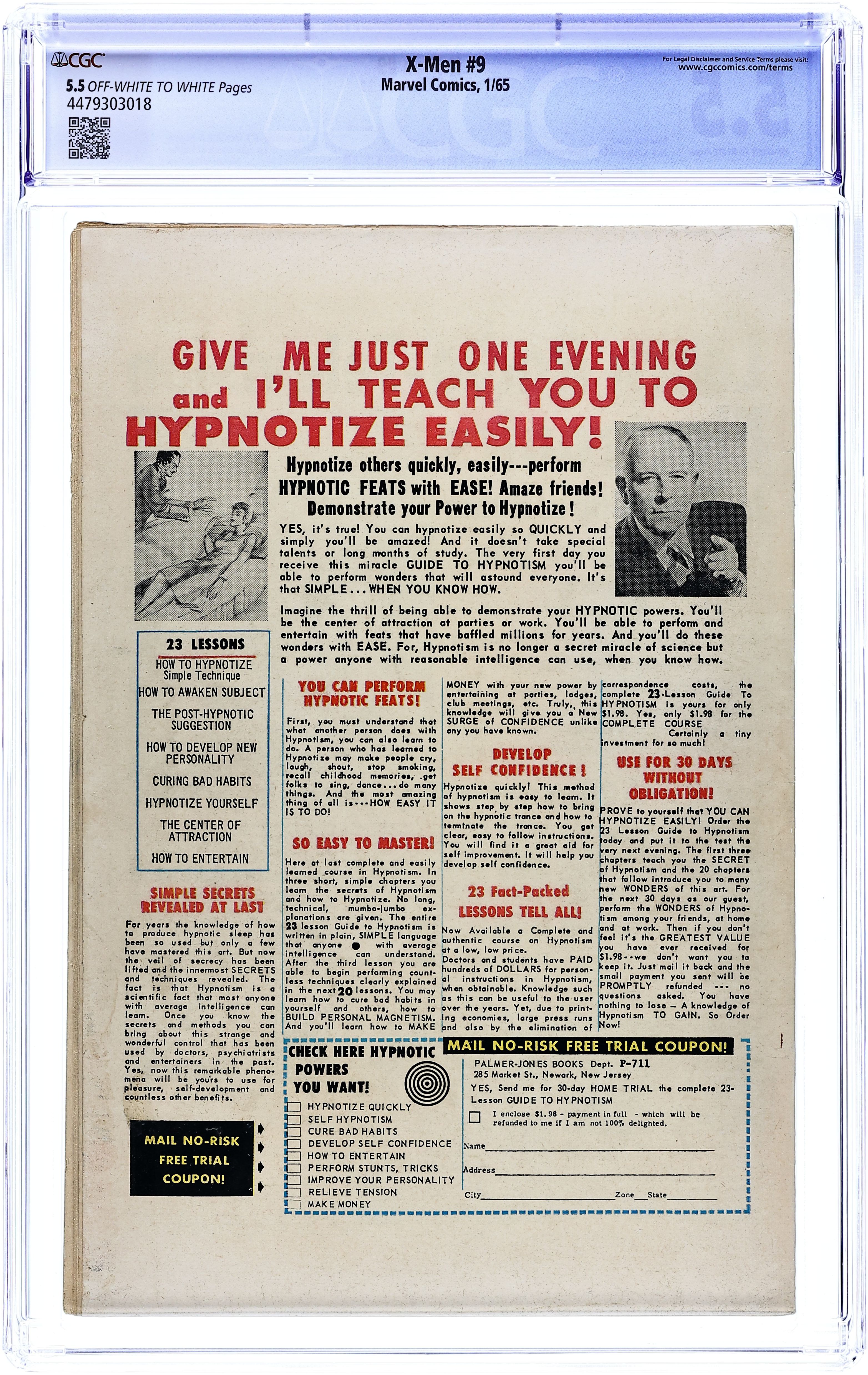 Cover pencils by Jack Kirby, inks by Chic Stone. The Return of the Blob, script by Stan Lee, pencils by Jack Kirby, inks by Chic Stone; The X-Men graduate from Xavier's school and the Professor tells them that he is taking a leave of absence; He puts Cyclops in charge while he is away and shows him his new mutant detecting machine, Cerebro; Magneto tracks down the Blob and invites him to join the Brotherhood; During a scuffle, Xavier's mental blocks dissolve and Blob remembers the secret of the X-Men; As this happens, the Blob's name lights up on Cerebro and Scott calls the X-Men away from a day of relaxation and back to battle with the evil mutants; During the battle with the Brotherhood, Magneto shoots missiles at the X-Men, even though the Blob is in the line of fire, and the hefty mutant, feeling betrayed, decides to return to carnival life. 1st appearance of Cerebro. 36 pgs. $0.12. Cover price $0.12.