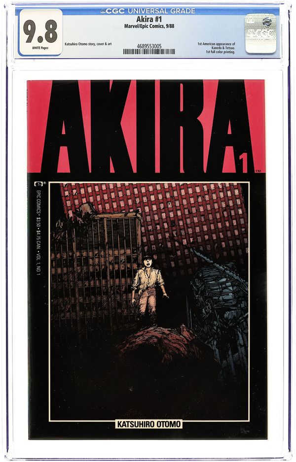 1st printing. Here it is – the first English translation of Katsuhiro Otomo's influential manga series, paving the way for the manga and anime craze to blossom in the English-speaking world. Decades after a mysterious explosion destroys Tokyo, teen bikers Tetsuo and Kaneda encounter a child with the face of an old man; his strange powers hold the key to the mystery. Story, art and cover by Otomo. Color by Steve Oliff, who pioneered the use of computer coloring with this series. Also includes an introductory article by Archie Goodwin. Mature readers. Cover price $3.50.