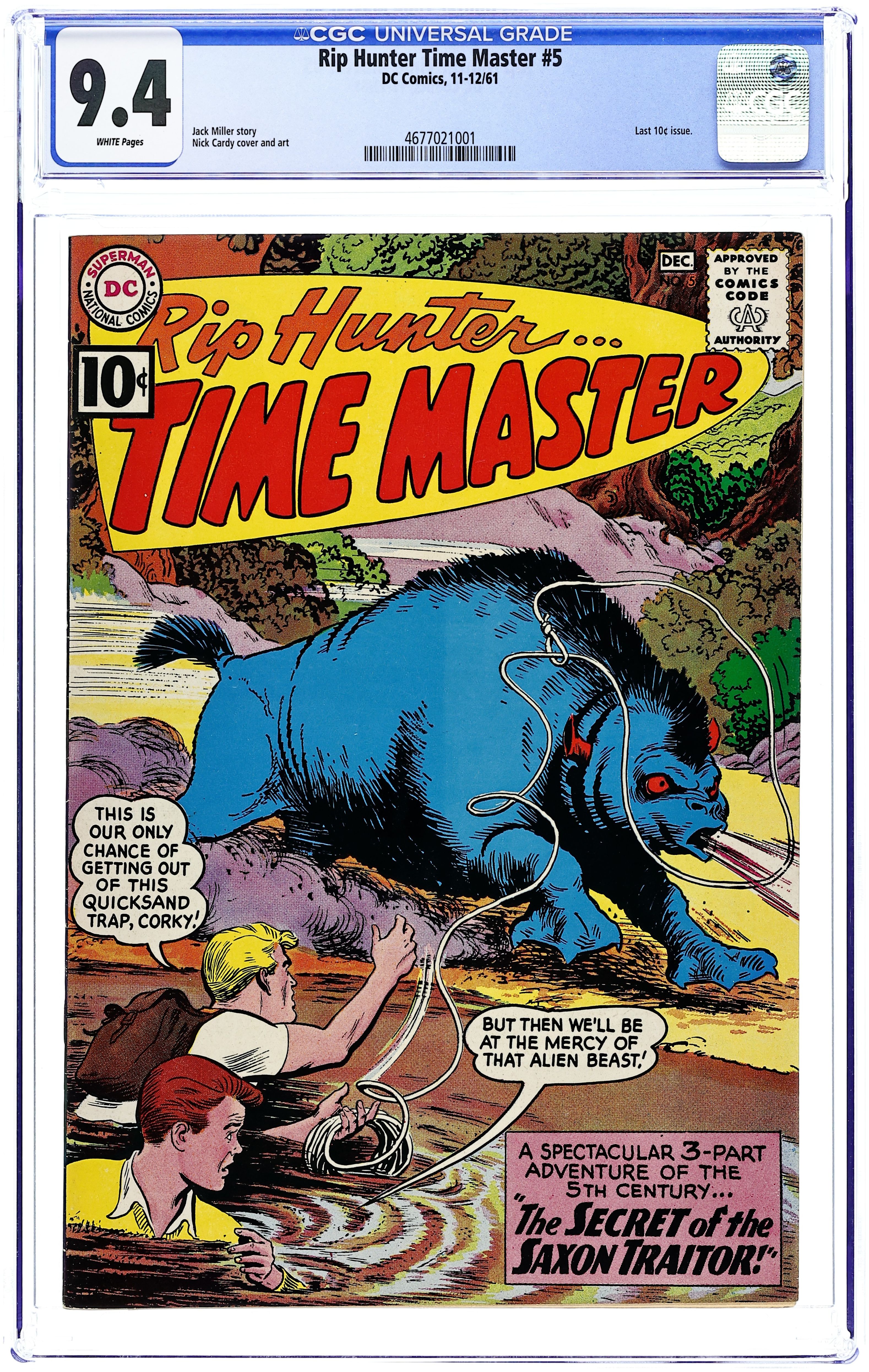 Last 10c cover-priced issue. Written by Jack Miller. Art and Cover by Nick Cardy. Rip and Corky have only one chance of getting out of the quicksand trap! But then they'll be at the mercy of an alien beast! Don't miss Rip Hunter in the spectacular 3-part adventure of the 5th century by Jack Miller and Nick Cardy: "The Secret of the Saxon Traitor"; "Chapter 2: The Creatures of Doom Valley"; and "Chapter 3: The Ancients vs. the Aliens"! Plus: 1-page text piece "The Hoax That Won a War!" 32 pages, full color. Cover price $0.10.