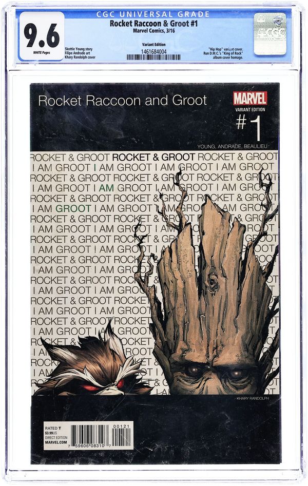 Hip Hip Variant Cover by Khary Randolph. Written by Skottie Young. Art by Filipe Andrade. ROCKET RACCOON BREAKS BAD! There's a new criminal mastermind in the galaxy, and it's...ROCKET RACCOON?! How did this happen? SERIOUSLY, HOW DID THIS HAPPEN, YOU GUYS??? Groot knows, but he's not talking! Well, he is talking, but all he's saying is...oh, you know. Diabolical danger, madcap mysteries and astonishing adventure abound as SKOTTIE YOUNG and FILIPE ANDRADE return to tell tall tail tales of Rocket Raccoon, now with the adorable, arboreal Groot along for the ride! If you love adventure, animals, outer space and just about anything in between, this is the book for you! 28 pages, full color. Rated T Cover price $3.99.