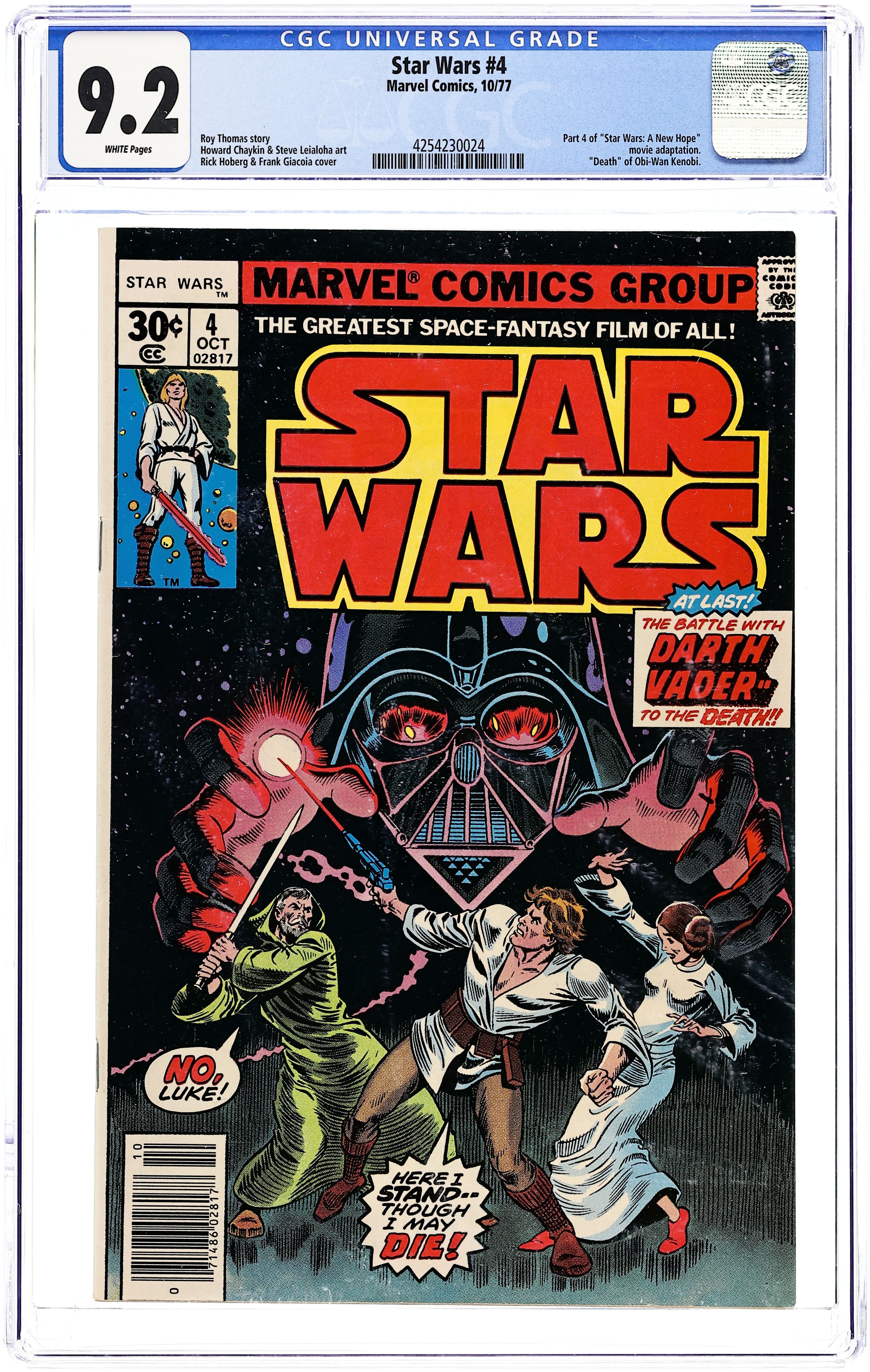 1st printing, standard 30 Cent Newsstand Edition with UPC. A New Hope: Part 4 of 6. "In Battle with Darth Vader!" Based on the screenplay by George Lucas. Adapted by Roy Thomas. Art by Howard Chaykin and Steve Leialoha. While Luke, Han, Leia, and the rest try desperately to escape the confines of the Death Star, Ben Kenobi stands face-to-face with the deadliest Sith Lord the Dark Side has ever produced, Darth Vader! As the two bitter enemies duel to a stalemate with lightsabres, the old jedi soon realizes that for Luke, and the galaxy for that matter, to go on, he may have to make the ultimate sacrifice. Cover price $0.30.