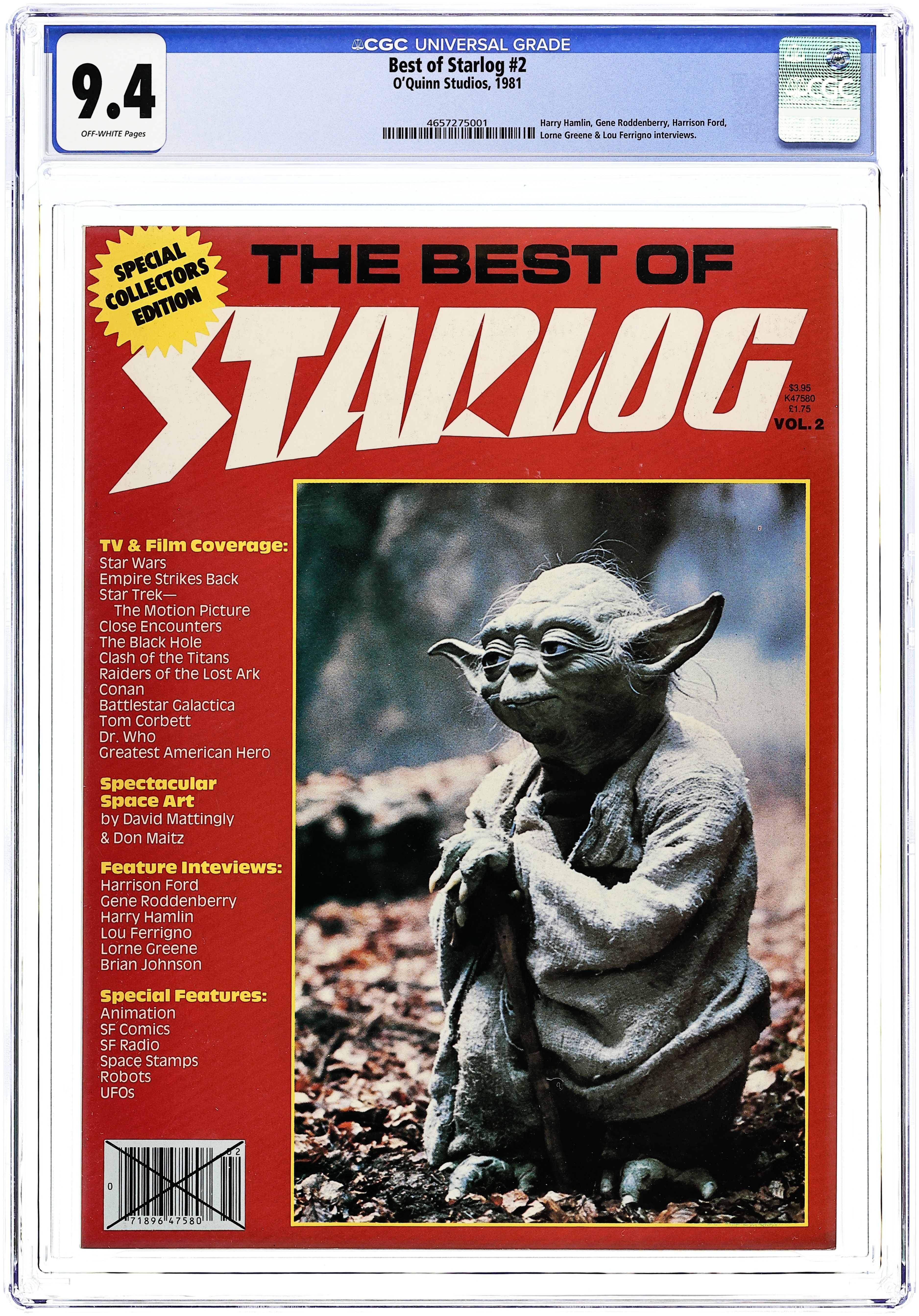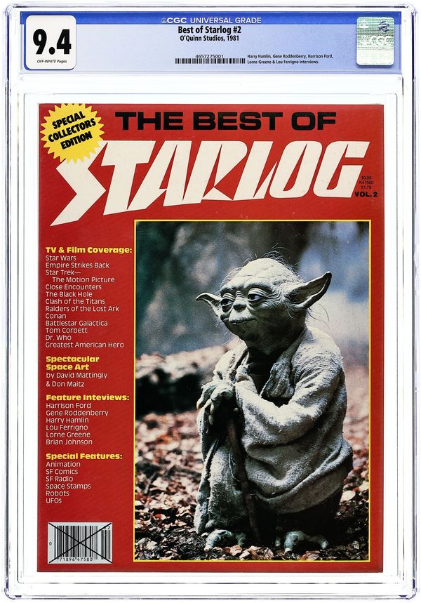 Direct Edition. TV & film coverage: Star Wars Episode IV: A New Hope, Star Wars Episode V: The Empire Strikes Back, Star Trek: The Motion Picture, Close Encounters of the Third Kind, The Black Hole, Clash of the Titans, Raiders of the Lost Ark, Conan, Battlestar Galactica, Tom Corbett, The Greatest American Hero; Spectacular Space Art by David Mattingly & Don Maitz; Feature Interviews: Harrison Ford, Gene Roddenberry, Harry Hamlin, Lou Ferrigno, Lorne Greene, Brian Johnson; Special Features: animation, SF comics, SF radio, space stamps, robots, UFOs. Yoda cover. Cover price $3.95.
