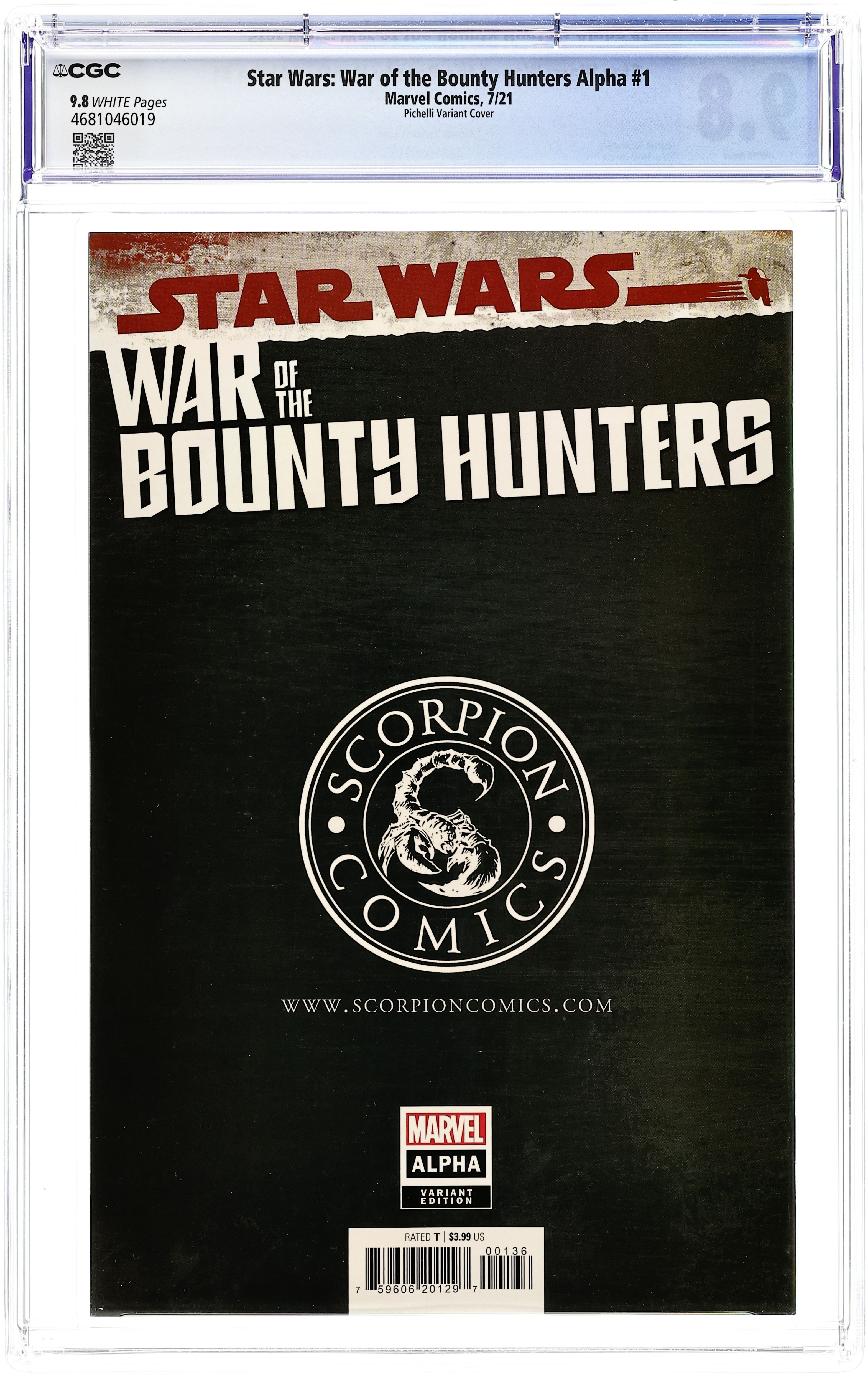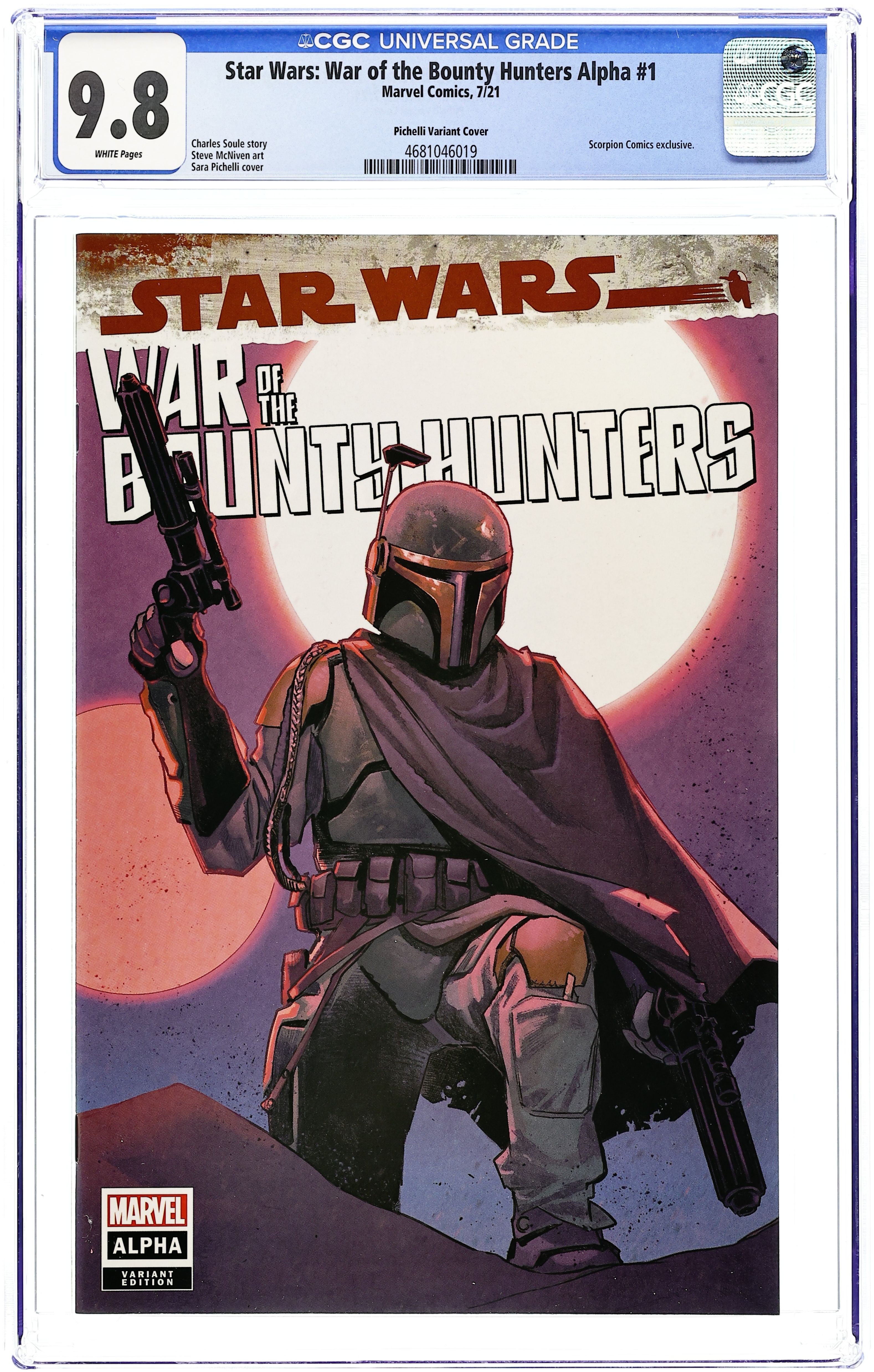 Scorpion Comics Exclusive Variant Cover by Sara Pichelli. Written by Charles Soule. Art by Steve McNiven. THE STAR WARS COMIC EVENT YOU'VE BEEN WAITING FOR! The notorious bounty hunter BOBA FETT has finally landed his greatest prize - HAN SOLO, frozen in carbonite for easy transport. Fett will bring the smuggler to TATOOINE to collect the massive bounty placed on Solo's head by the fearsome crime lord JABBA THE HUTT. Sounds easy. What could go wrong? 28 pages, full color. Rated T Cover price $3.99.