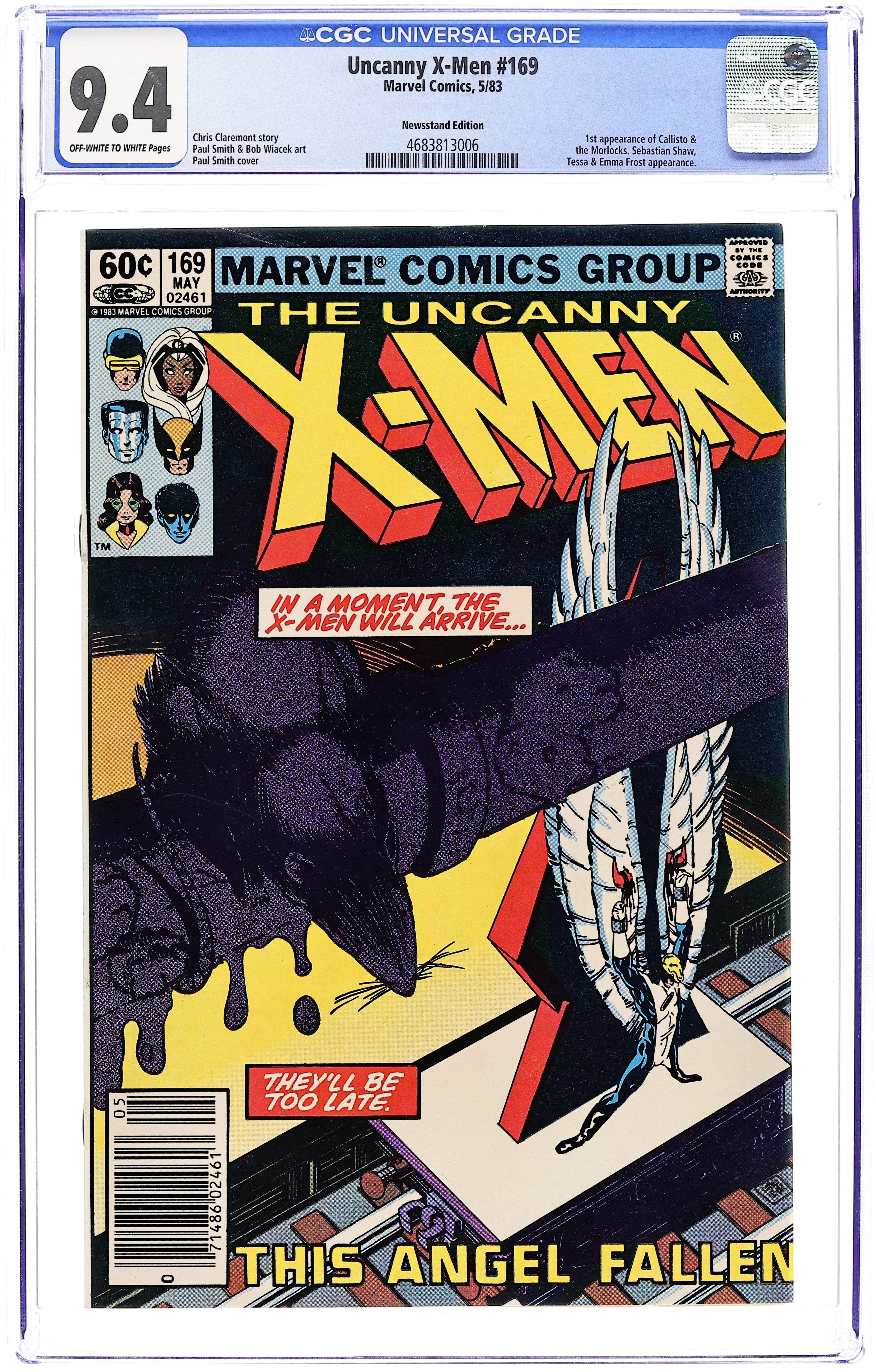 Newsstand Edition. "Catacombs!" Part 1 of 2. Story by Chris Claremont. Art by Paul Smith and Bob Wiacek. Angel has been kidnaped by a fanatical group of mutants that live below the streets of Manhattan. Now the X-Men race against the clock to save the life of the former teammate, but are they ready for what they find in the tunnels of the Morlocks? NOTE: 1st appearance of Callisto and the Morlocks. 36 pgs. Cover price $0.60.