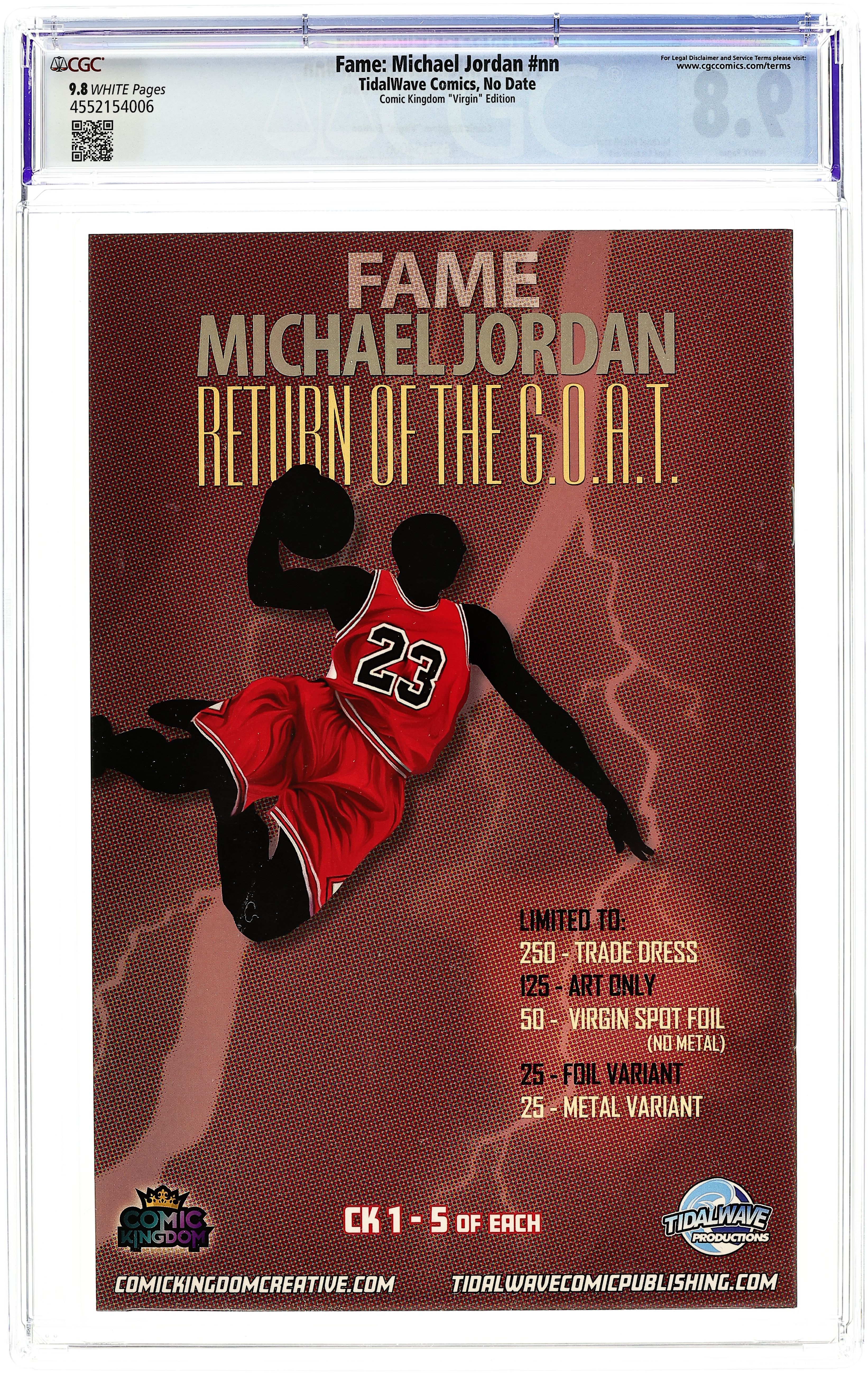 Comic Kingdom Creative Exclusive "Return of the G.O.A.T." Edition Virgin Cover by Sheldon Bueckert - limited to 125 copies. Story by Michael Frizell. Art by Igor Cicarini. Michael Jordans determination led him to on-the-court success at Emsley A. Laney High School and later at the University of North Carolina at Chapel Hill, where he made history with his game-winning shot in the 1982 NCAA Championship. As Jordans basketball career flourished with the Chicago Bulls, he transcended the sport, revolutionizing sports marketing with the Air Jordan brand in partnership with Nike. Despite controversies surrounding his intense competitiveness and gambling, Jordans philanthropic efforts and business ventures further cemented his legacy beyond the court. The comic also delves into Jordans personal life, including his marriages, family relationships, and enduring impact on the basketball community. Highlighting key moments like his iconic playoff performances and championship-winning shots, this comic celebrates Jordans enduring legacy as one of the greatest athletes ever. 22 pages.