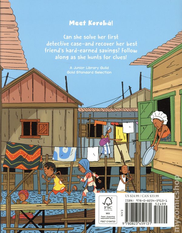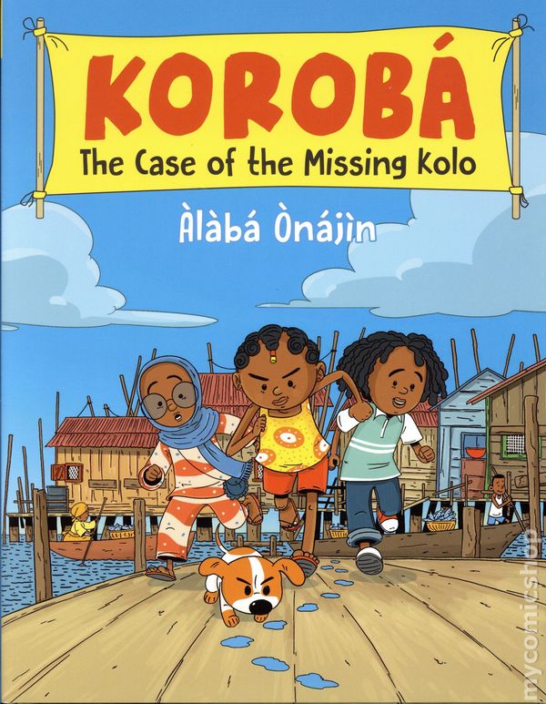 1st printing. Story and art by Àlàbá Ònájìn. A charismatic young sleuth takes on a case close to home in this new graphic novel series set in a vibrant African community. Ten-year-old Korobá knows everyone in Makoko, the Nigerian fishing village where she lives. She knows her way up and down the bright, colorful waterways, knows where to sell fried shrimp, and knows what to look for at the crowded daily market. Makoko is her playground, and she roams free with her best friends, Saidat and Joba, and her adorable dog, Popi. The last thing Korobá would expect in Makoko is a thief. Yet Saidat's wooden piggy bank—her Kolo—has been stolen. The children of Makoko save coins in their Kolo all year long, waiting to spend their money at the annual harvest festival. Saidat saved and saved, but now she will have nothing. Its not fair! Korobá knows what good detectives do…(sort of?). Should the primary suspect be Saidat's grumpy cousin, visiting on vacation? Or could it be the village carpenter, who has been doing some work on Saidat's house? It's up to Detective Korobá to catch the thief and find the missing Kolo before Breaking Day! Buckle up, budding mystery fans… Its time to join Korobá and friends on their thrilling chase for the culprit. With rich, detailed illustrations—featuring some very important clues—that bring Makoko to life, this one-of-a-kind series is a modern day Tintin meets Encyclopedia Brown. Hardcover, 7-in. x 9-in., 144 pages, full color. Age 7-11 years Cover price $24.99.