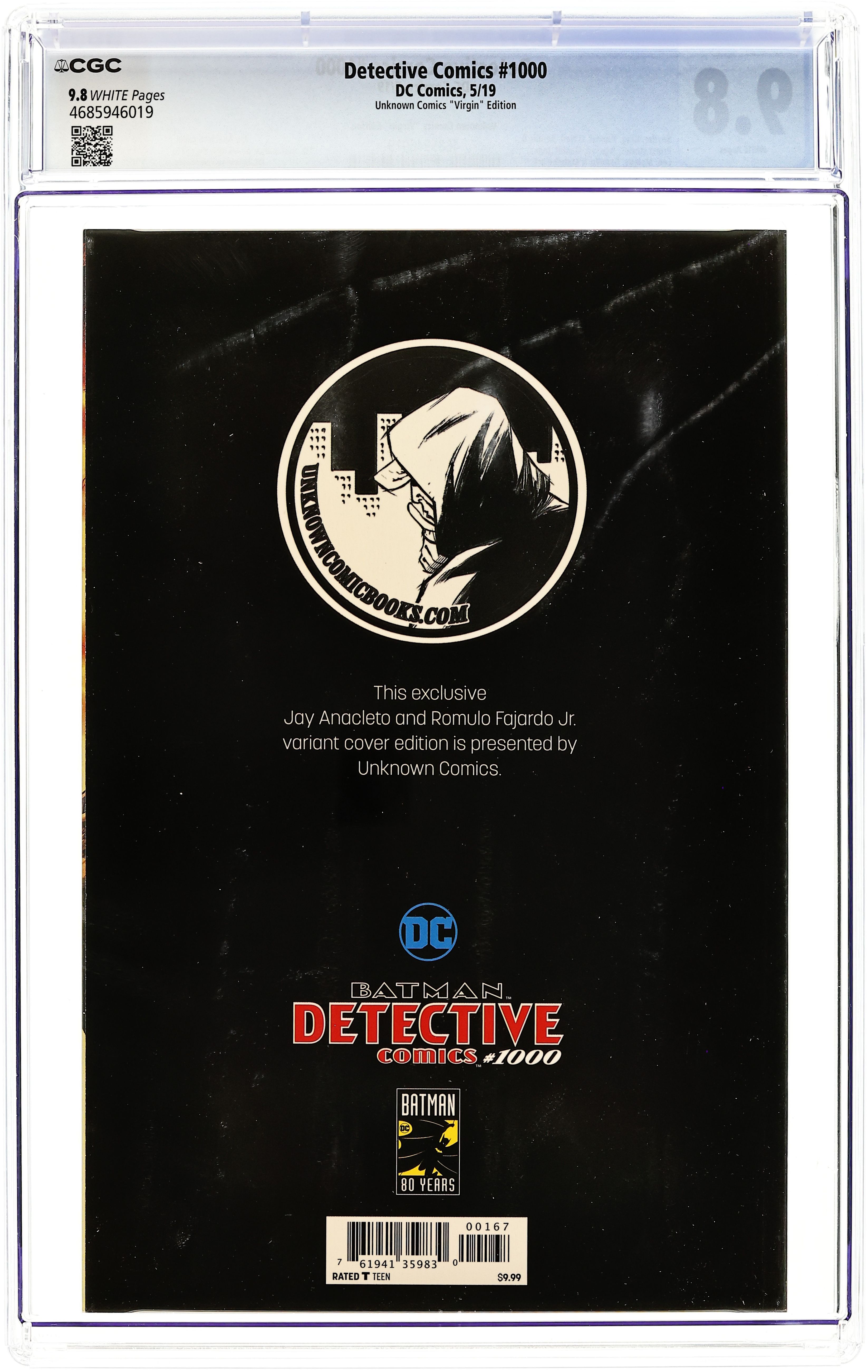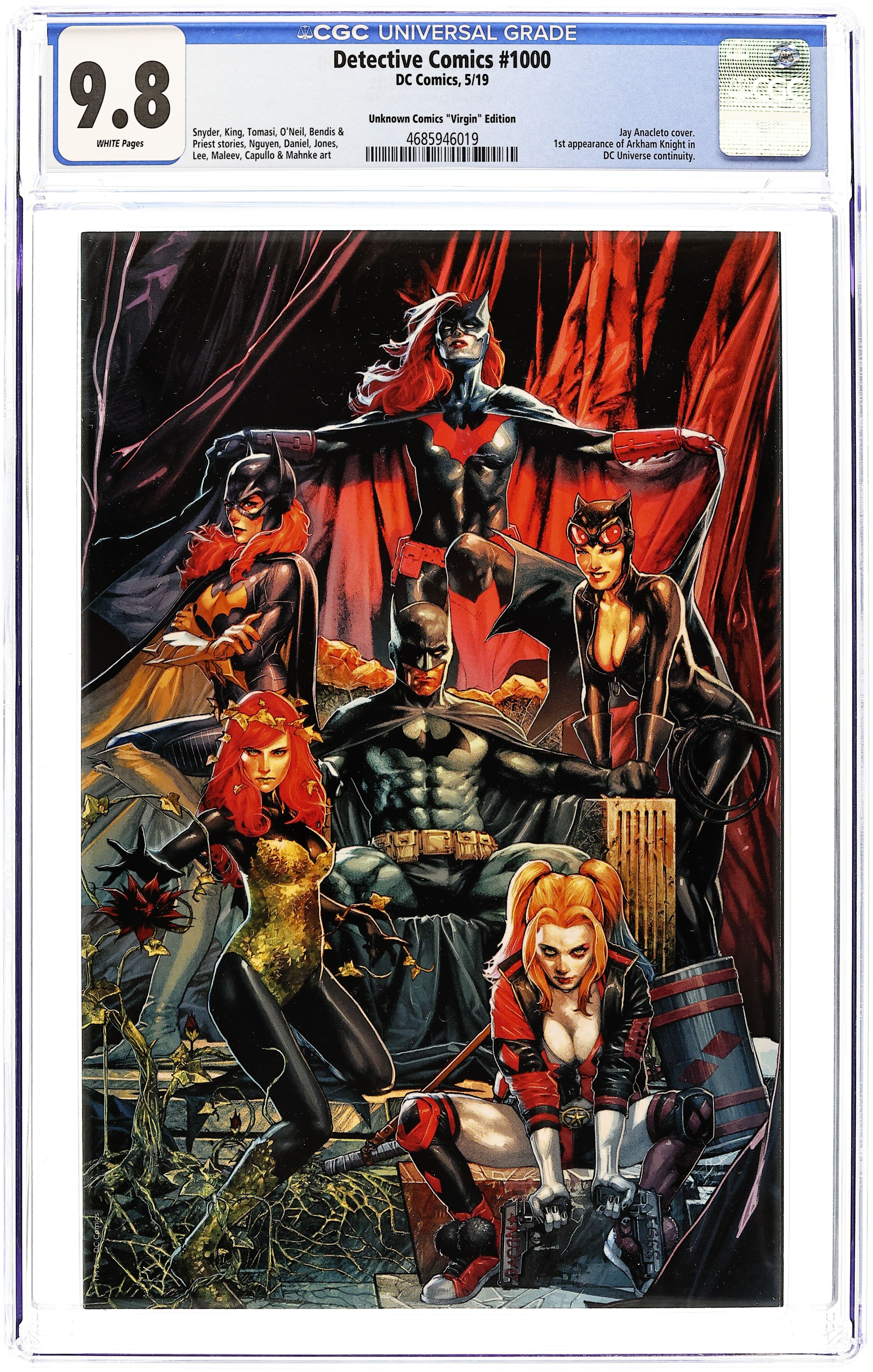 Unknown Comics Exclusive Virgin Cover by Jay Anacleto. Written by Peter J. Tomasi, Brian Michael Bendis, Matt Fraction, Greg Rucka, James Tynion IV, Kelly Sue DeConnick, Marv Wolfman, Grant Morrison, Tom King, Scott Snyder, Dan Jurgens and Mariko Tamaki. Art by Brad Walker, David Marquez, Chip Zdarsky, Eduardo Risso, Riley Rossmo, John Romita, Jr., Emanuela Lupacchino, Chris Burnham, Walter Simonson, Ivan Reis, Dan Jurgens, Dan Mora, Andrew Hennessy, Klaus Janson, Bill Sienkiewicz, Joe Prado and Kevin Nowlan. Light the Bat-Signal, because Detective Comics (2016 3rd Series) #1027 is here! In honor of Batman's first appearance in Detective Comics (1937 1st Series) #27, this special, book-size celebration brings you the biggest names in comics as they chronicle the most epic Batman adventures Gotham City and the DC Universe have ever seen! The World's Greatest Detective has a mountain of cases to crack: Who murdered Gotham's most corrupt police officer? What does The Joker's annual visit mean for Bruce Wayne? And most importantly, what WayneTech mystery will sow the seeds of the next epic Batman event? All this and more await you within the pages of the biggest Batman issue of them all! Featured in this Mega Spectacular: "Blowback" by Peter J. Tomasi, Brad Walker and Andrew Hennessy; "The Master Class" by Brian Michael Bendis and David Marquez; "Many Happy Returns" by Matt Fraction and Chip Zdarsky; "Rookie" by Greg Rucka and Eduardo Risso; "Ghost Story" by James Tynion IV and Riley Rossmo; "Fore" by Kelly Sue DeConnick, John Romita, Jr. and Klaus Janson; "Odyssey" by Marv Wolfman, Emanuela Lupacchino and Bill Sienkiewicz; the debut of The Silver Ghost in "Detective #26" by Grant Morrison and Chris Burnham; "Legacy" by Tom King and Walter Simonson; "As Always" by Scott Snyder, Ivan Reis and Joe Prado; Batman gets transported back to 1939 in "Generations: Fractured" by Dan Jurgens and Kevin Nowlan; and "A Gift" by Mariko Tamaki and Dan Mora. Plus pin-ups by José Luis García-López, Jamal Campbell, Jim Cheung, Lee Bermejo and Olivier Coipel. 140 pages, full color. Ages 13+