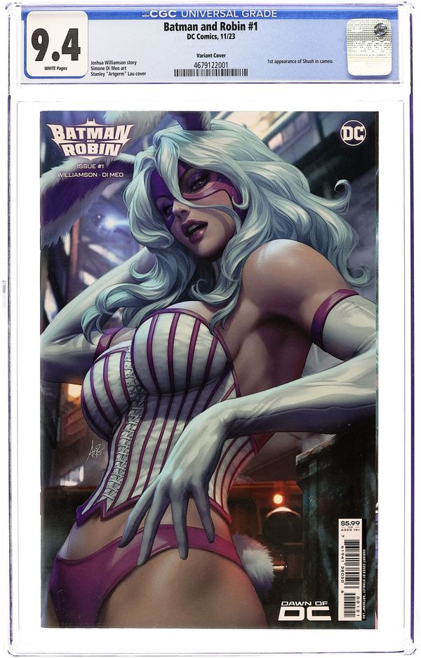 Foil Cover Variant. Written by Joshua Williamson. Art by Simone Di Meo. Cover by Stanley Artgerm Lau. Father and son. Bruce and Damian. Batman and Robin. From Batman vs. Robin to Knight Terrors, a lot has happened to the Dynamic Duo, but now they are back together and ready to fight crime in Gotham--just in time for Batman's most monstrous rogues to team up to turn the city into an urban jungle! A new villain watches from the shadows, intent on revenge, with a plot to turn one of Batman's greatest assets against him! Can Damian help his father solve the case before it's too late? A brand-new fun and exciting father-and-son adventure begins, from DC Comics architect Joshua Williamson and superstar artist Simone Di Meo! 32 pages, full color. Rated T+ Cover price $7.99.