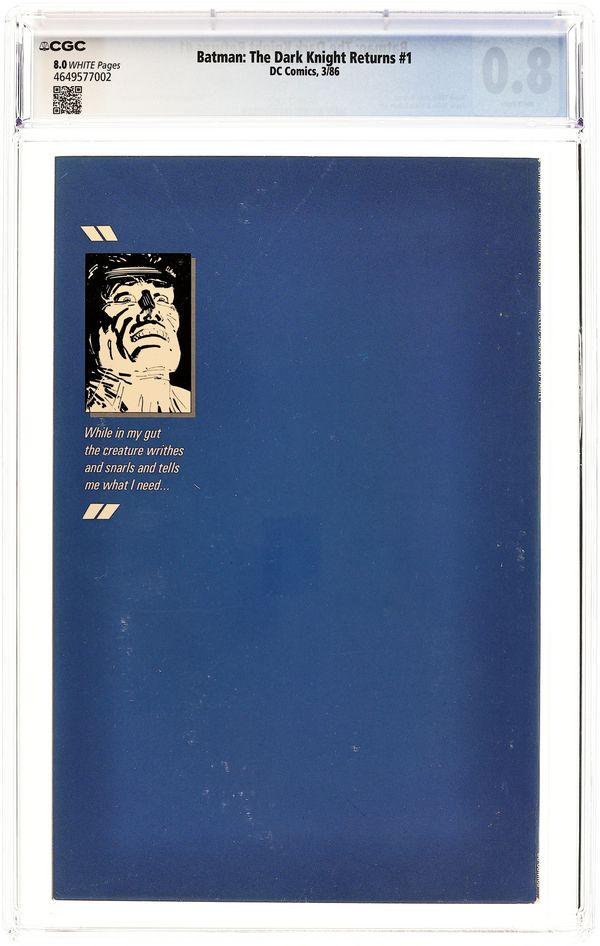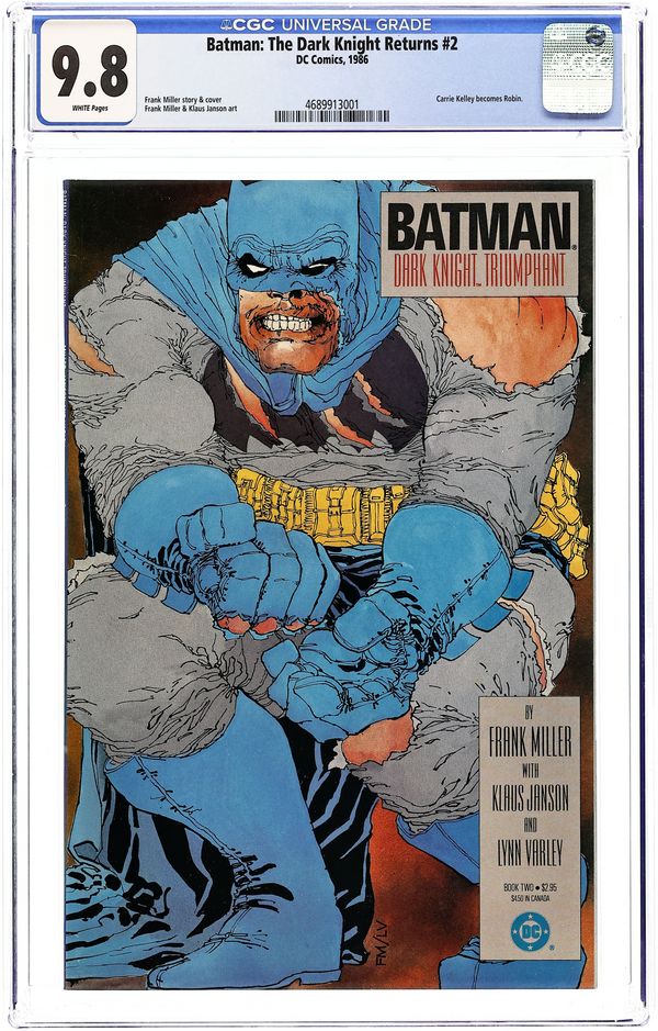 First printing. Direct Edition. NOTE: 1st printing has almost matching grey background on inside front cover and facing page. 2nd printing doesn't have matching gray background--grays are very different. 3rd printings are labeled as such. Cover by Frank Miller. "Dark Knight Triumphant," script by Frank Miller, pencils by Frank Miller, inks by Klaus Janson; an aging Batman battles the Mutant gang and their anonymous leader; While walking to work, considering retirement, Jim Gordon is almost killed by a 17-year old boy with an M60; Carrie Kelly, a young girl who owes her life to Batman, seeks out her hero and becomes Robin. 52 pgs., full color. Cover price $2.95.