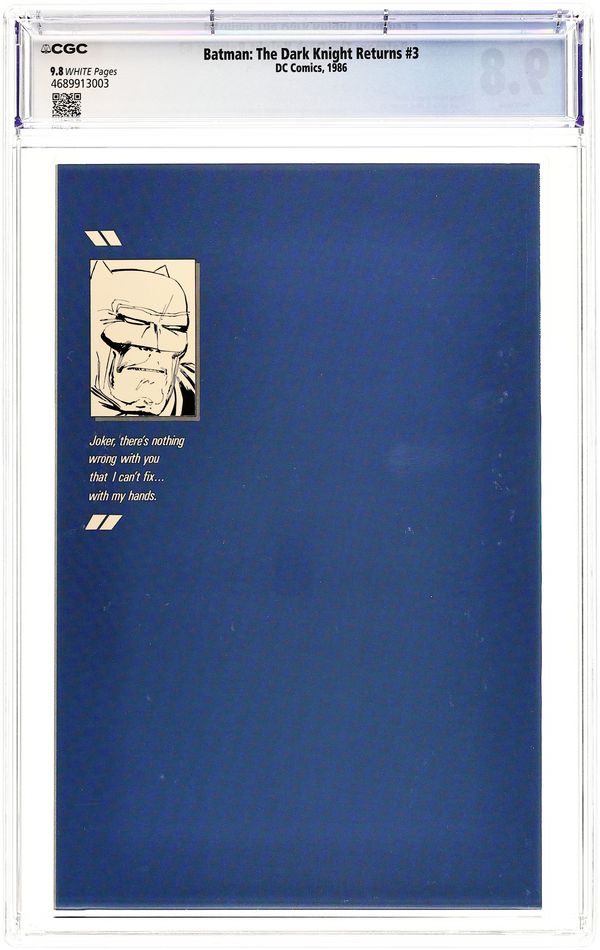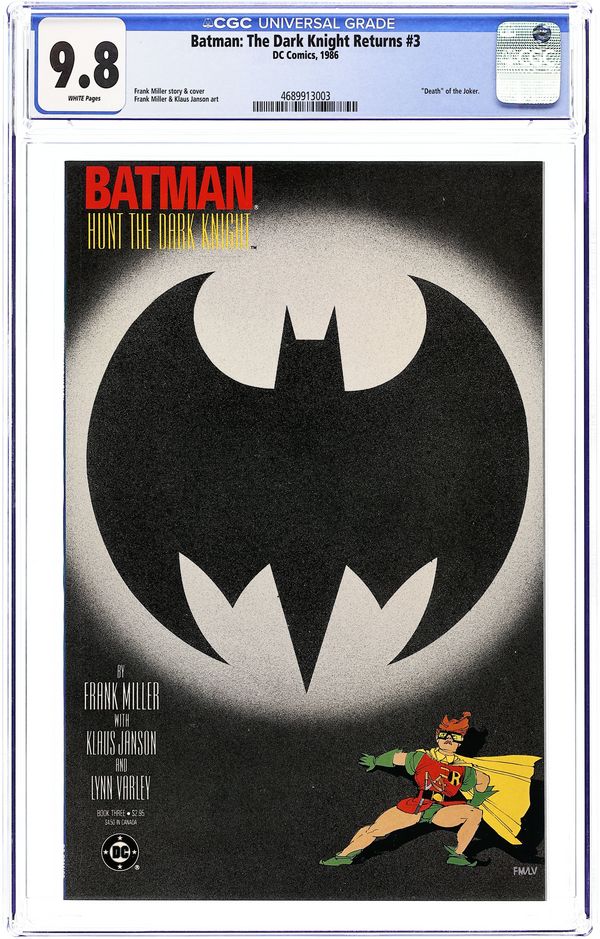 1st printing. NOTE: 2nd printing of #3 is clearly labeled as such on the inside cover. "Hunt The Dark Knight," script and pencils by Frank Miller, inks by Klaus Janson and Frank Miller; Batman battles the Joker, who has convinced his psychiatrist, Dr. Bartholomew Wolper, that he is sane and regretful; Seeking to discredit Batman, Wolper exhibits the Joker on a late-night show ("David Endochrine", parodying Late Night with David Letterman) to try and show that the Joker is actually a victim of Batman's own psychosis; As the police attack Batman, the Joker murders everyone in the studio; Batman follows him to Selina Kyle's place, where the former Catwoman has become a depressed alcoholic; Superman is introduced as an undercover agent for the American government. 52 pgs., full color. Cover price $2.95.