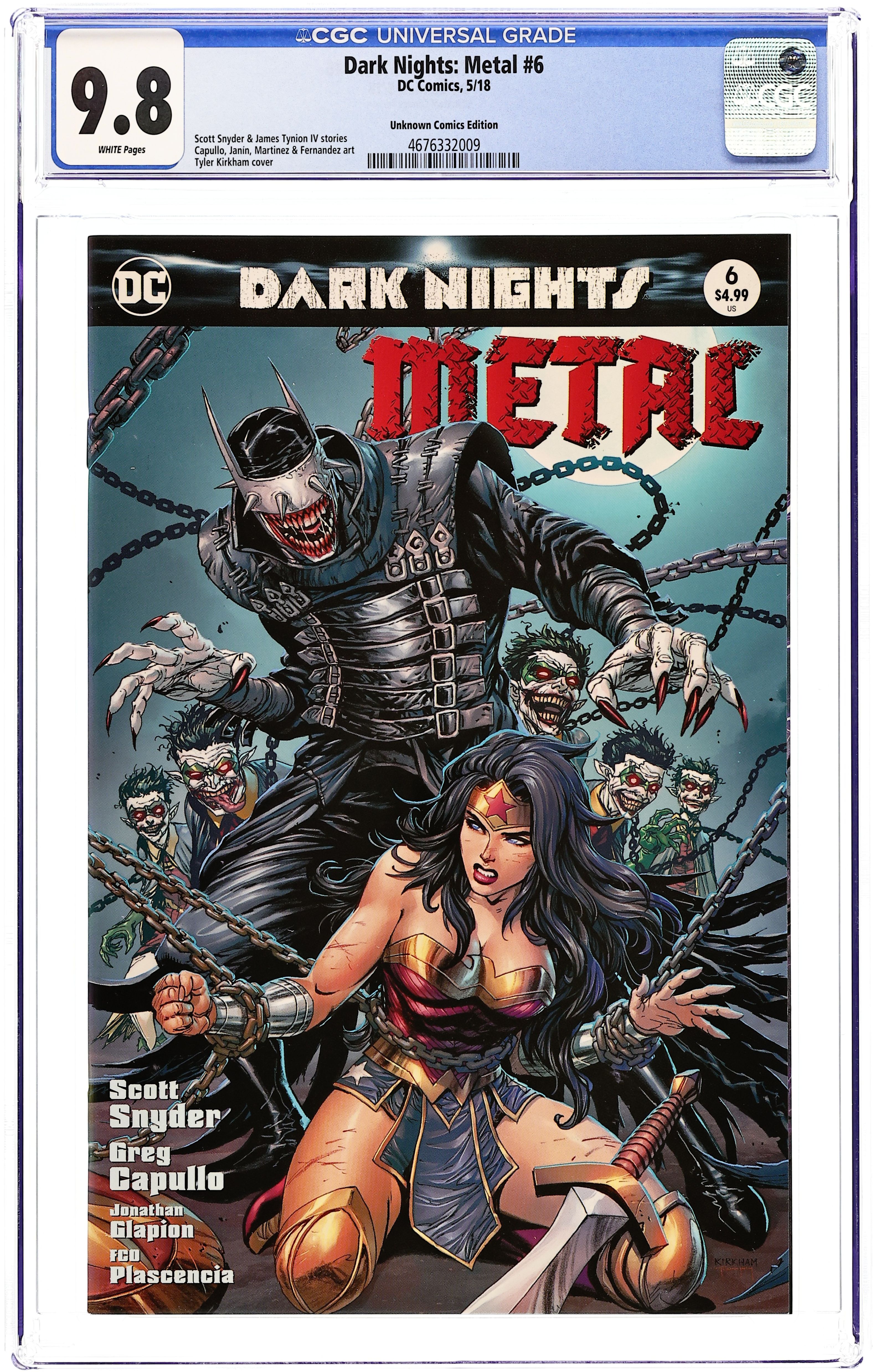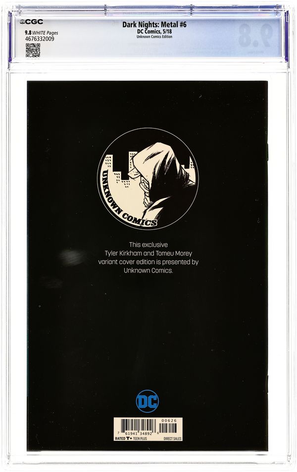 Unknown Comics Exclusive Virgin Cover by Tyler Kirkham. Written by Scott Snyder. Art by Greg Capullo and Jonathan Glapion. All roads lead…to darkness. In the devastating and epic conclusion to DC's cataclysmic event series, heroes from across the universe make their final charge into the unknown to battle the forces of the Dark Multiverse! Space and time, dreams and nightmares, all will collide - and what is left at the end will leave the DC Universe irrevocably changed! 48 pages, full color. Rated T+ Cover price $4.99.