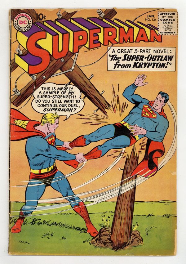 Starts Mar 9 Cover pencils by Curt Swan, inks by Stan Kaye. The Super-Outlaw From Krypton: Part 1: The Super-Menace of Metropolis, script by Otto Binder, pencils by Wayne Boring, inks by Stan Kaye; Superman has gone crazy, causing unnecessary damage whenever he performs a super-feat. The Super-Outlaw From Krypton: Part 2: The Revenge Against Jor-El; Kull-Ex has tricked Superman into switching places. he Super-Outlaw From Krypton: Part 3: The Duel of the Supermen; Supergirl rescues Superman from Kandor (Supergirl's first appearance in this series). 36 Pages, Full Color. Cover price $0.10.