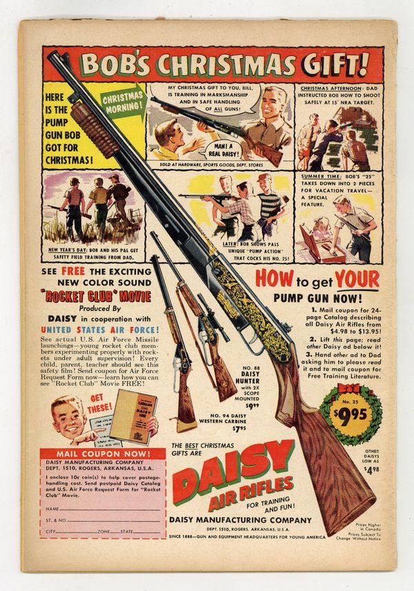 Starts Later today Cover pencils by Wayne Boring, inks by Stan Kaye. Superman For Sale starring Superman, Henry Drebbin, Edward Jorgens, and Paul Quillan, script by Bill Finger, pencils by Wayne Boring, inks by Stan Kaye. The Midget Menace starring Superman and The Thurans, script by Edmond Hamilton, pencils by Wayne Boring, inks by Stan Kaye; Superman is tied down like Gulliver. The Best Present Of All! public service announcement starring Binky, script by Jack Schiff, art by Win Mortimer. Rocket To The Sky text story. The Million Dollar Mistake starring Superman and Soapy Martin, art by Al Plastino. CinemaAntics humor half-page by Harry Lampert. A two-page ad features Superman products available for Christmas. Fearless Fosdick stars in a quarter-page ad for Wildroot Cream-Oil with art by Al Capp. 36 Pages, Full Color. Cover price $0.10.