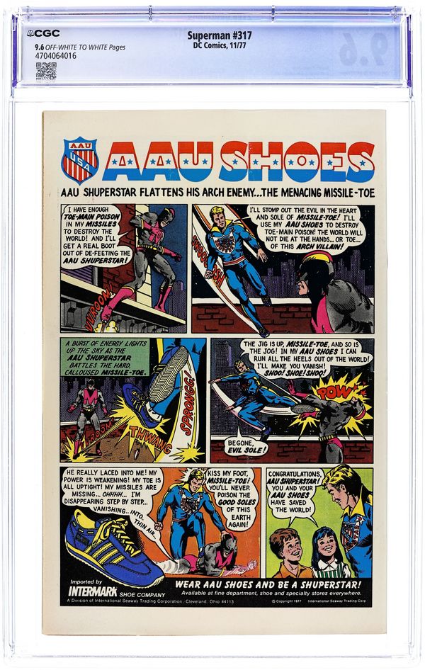 Superman origin retold. Cover pencils by Curt Swan, inks by Bob Oksner. Superman, 2001!, script by Cary Bates and Elliot S! Maggin, pencils by Curt Swan, inks by Bob Oksner; What if Baby Kal-El landed on Earth in 1976? Found by the American military just ahead of the Soviets, Kal-El is raised as a ward of the Army; Tensions over the alien superhuman, now called Skyboy, boil over in 1990 with both the U.S. and the U.S.S.R. launching missiles. Skyboy destroys all of the weapons and abandons his Skyboy identity to live as Clark Kent; In 2001, the Soviets send Moka to Times Square to declare himself the person who saved the planet in 1990 and the rightful ruler of mankind, but Clark comes out of retirement, this time as Superman, and exposes Moka for the fraud he is. 36 Pages, Full Color. Cover price $0.30.