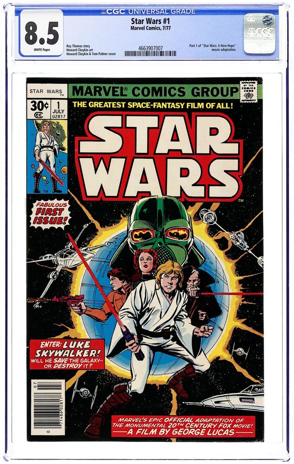 Ends Dec 22 9:24 PM CST Bid History 11 bids Current Bid $301 Your Secret Max Bid If you'd like to bid, please log in or register. 1st printing, standard 30 Cent Newsstand Edition with UPC. "A New Hope!" Part 1 of 6. Based on the screenplay by George Lucas. Adapted by Roy Thomas. Art by Howard Chaykin and Steve Leialoha.
