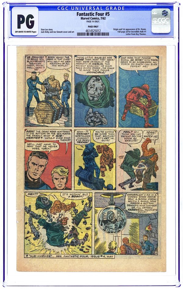 Cover pencils by Jack Kirby, inks by Joe Sinnott. Origin and first appearance of Doctor Doom in "Prisoners of Doctor Doom!" Part 1, script by Stan Lee, pencils by Jack Kirby, inks by Sol Brodsky; Doctor Doom takes the Invisible Girl hostage to insure her teammates' obedience. Part 2 Back to the Past!; Doctor Doom brings the FF to his castle stronghold in the USA; There he sends the Torch, the Thing and Mr. Fantastic back in time to retrieve the pirate Blackbeard's treasure. Part 3 On the Trail of Blackbeard; The Thing takes command of a sailing ship in the era of the pirate Blackbeard. Part 4 Battle; The Thing takes on the role of Blackbeard the Pirate and wishes to remain in the past. Part 5 "The Vengeance of Doctor Doom!"; Doom tries to kill the FF when they return from the past, but Invisible Girl saves them. Doom escapes with his jetpack. Hulk cameo. Letter to the editor from comics writer Roy Thomas. 36 pgs. $0.12. Cover price $0.12.