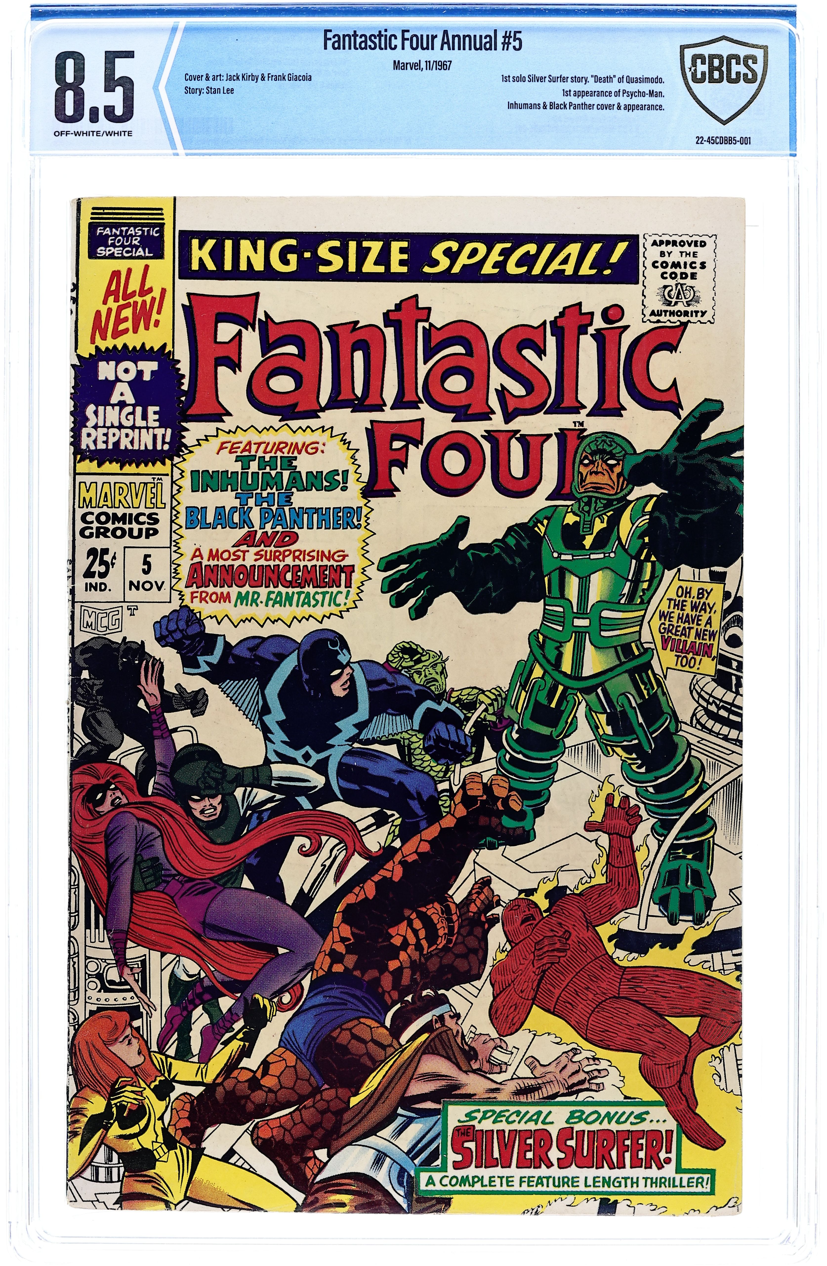 The Black Panther and the Inhumans help the FF battle Psycho-Man (his first appearaince) in "Divide and Conquer!" Script by Stan Lee, pencils by Jack Kirby, inks by Frank Giacoia (not Joe Sinnott as credited). Silver Surfer back-up (first solo story), "The Peerless Power of the Silver Surfer!" by Lee/Kirby/Giacoia. This issue also has eight pages of pin-ups by Kirby/Giacoia and a short story, "This Is a Plot?" Script and pencils by Kirby, inks by Giacoia. Kirby/Giacoia cover. 68 pages, full color. Cover price $0.25.