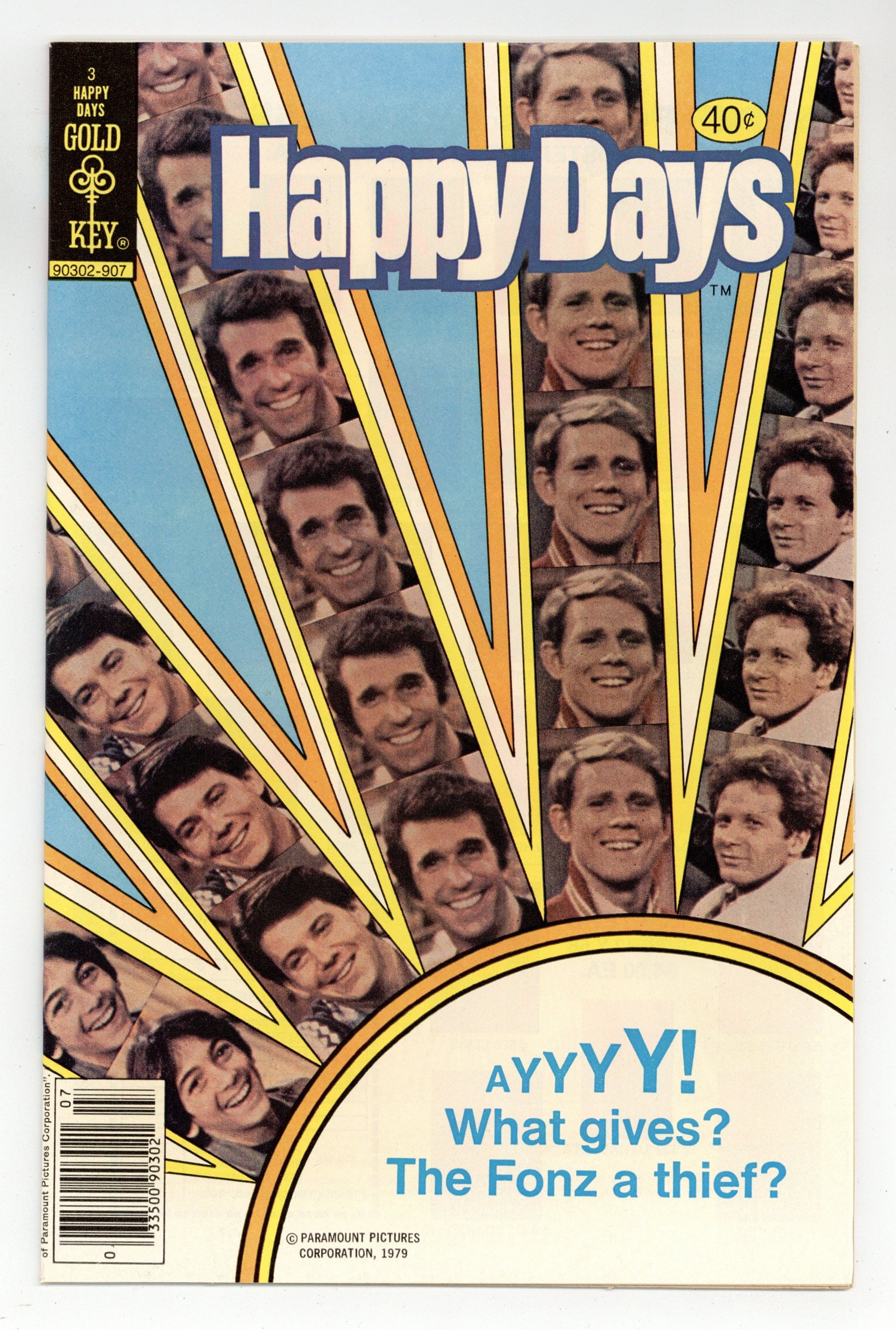 Photo cover featuring Charles "Chachi" Arcola (Scott Baio); Warren "Potsie" Weber (Anson Williams); Arthur "Fonzie" Fonzarelli (Henry Winkler); Richie Cunningham (Ron Howard); and Ralph Malph (Don Most). Male Fraud, art by Bill Williams; Chachi starts a chain letter campaign which promises a date with Fonzie for every girl who keeps the chain going. Framed!, art by Bill Williams; A trouble-maker named Dick Fixx steals a number of valuables and frames Fonzie for the crimes. Matinee Idol, art by Bill Williams; Ralph falls for a girl named Marcie, and becomes convinced he looks like Humphrey Bogart. Star Trek the Motion Picture ad. Based on the classic TV series. 36 pgs., full color. $0.40. Cover price $0.40.