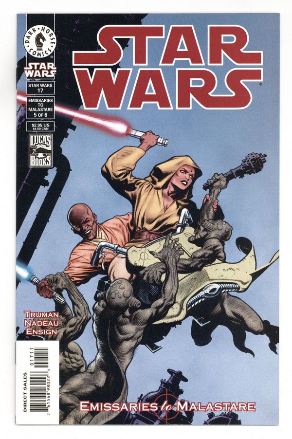 Tags: Star WarsPublished Apr 2000 by Dark Horse.$26.00Emissaries To Malastare #5 by Timothy Truman, Tom Lyle, and Robert Jones; cover by Mark Schultz After encountering monstrous akk dogs under the command of the Red Iaro Terrorists on Malastare, Mace Windu and his former Padawan Depa Billaba travel to Nar Shaddaa in search of a smuggling ring that's transporting the animals from Mace's homeworld and turning them into savage pitfighting beasts. But the corridors and depths of the Smuggler's Moon are havens of scum and villainy?no place for Jedi! Cover price $2.95.