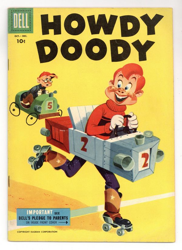 Dell Comics Pledge to Parents public service announcement. "Howdy Doody and the Magic Pony," script by Edward Kean; When the Magic Queen Grandmother places magic horseshoes on the Princess's hobbyhorse, he comes to life. "Powerful Medicine," script by Edward Kean; Chief Thunderthud and Thunderchicken try to sell their "Aragnak Magic Medicine," which is so potent that it burns holes in the cement sidewalk! Untitled story; Howdy and Dilly go on a camping trip and encounter a bee, a skunk, and two bears. "Flub-a-Dub Wins a Prize," script by Edward Kean; Grandpa Doody wins all the prize ribbons at the Doodyville County Fair…until the Flub-a-Dub finally wins one for the blueberry pie-eating contest. Clarabell illustration on back cover. 36 pages, full color. Cover price $0.10.