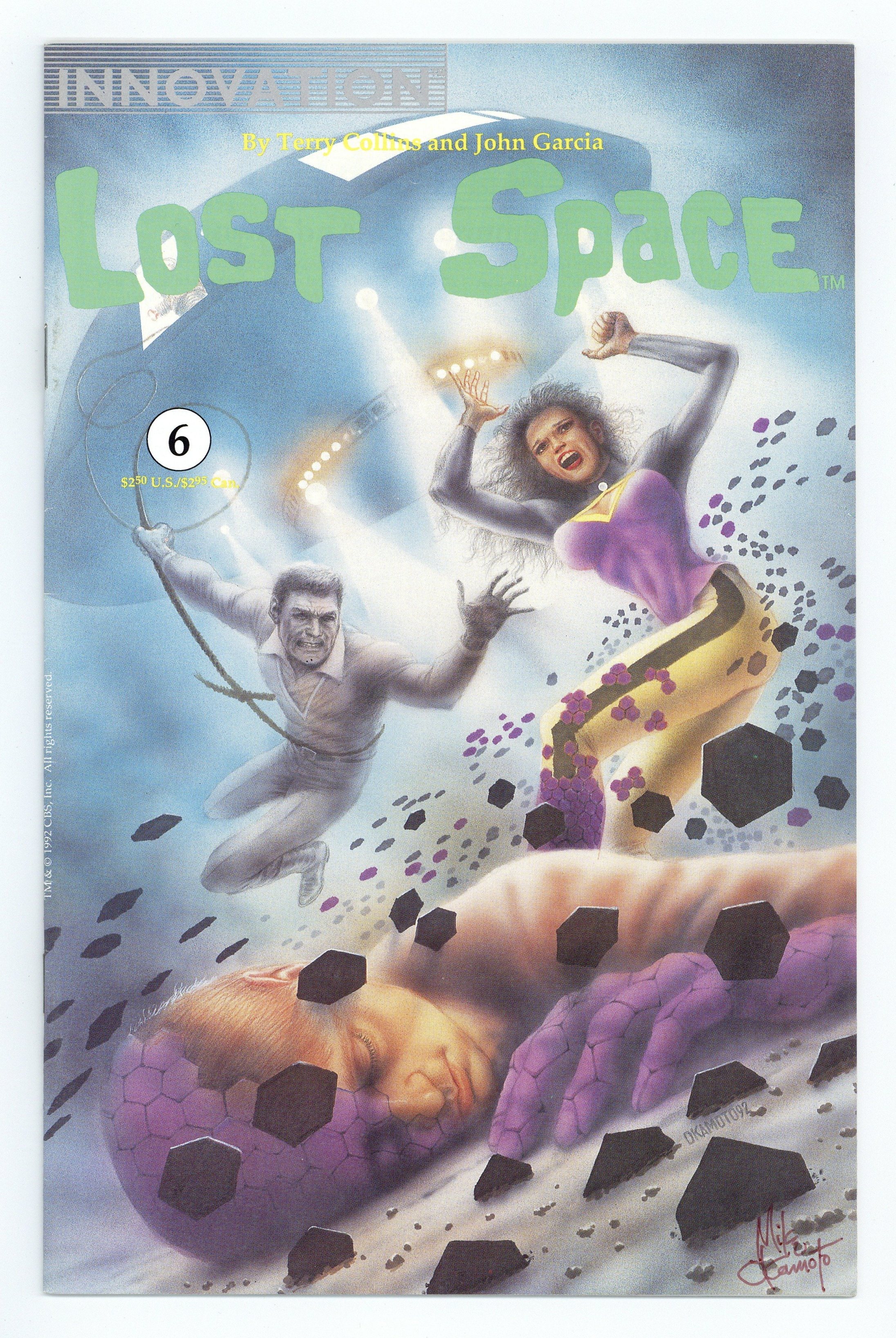 Painted cover art by Mike Okamoto. In Unity There is Strength, script by Terry Collins, art by John Garcia; Crashed on a planet from the last issue, the crew makes repairs and searches for deutronium for fuel; Lodged in the Chariot's secondary intake system is a box of hexagons which can envelop animate and inanimate matter. Memories, Memorabilia, And Beyond; Memories of the 1st 6 issues; Announcement of LIS Special Edition #1, Annual #1, Posters and a Portfolio with art-sized plates by Mike Okamoto. 4-page special preview of Innovation's "Dark Shadows." Promo for Lost in Space Annual #1, continuing the story in issue #6 with cast photos and unpublished art. Entry form for Comic Buyer's Guide Fan awards for 1991. 36 pgs. $2.50. Cover price $2.50.
