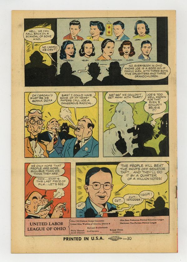 Starts Jan 3 Robert Alphonso Taft Story (1949) is a promotional comic book. It is political giveaway comic sponsored by the United Labor League of Ohio and their candidate, Joe Ferguson. This promo was done in order to discredit Senator Taft in his 1950 Ohio re-election bid. The tone is distinctly pro-union. 10c cover price. Cover price $0.10.