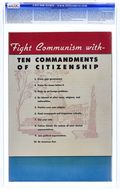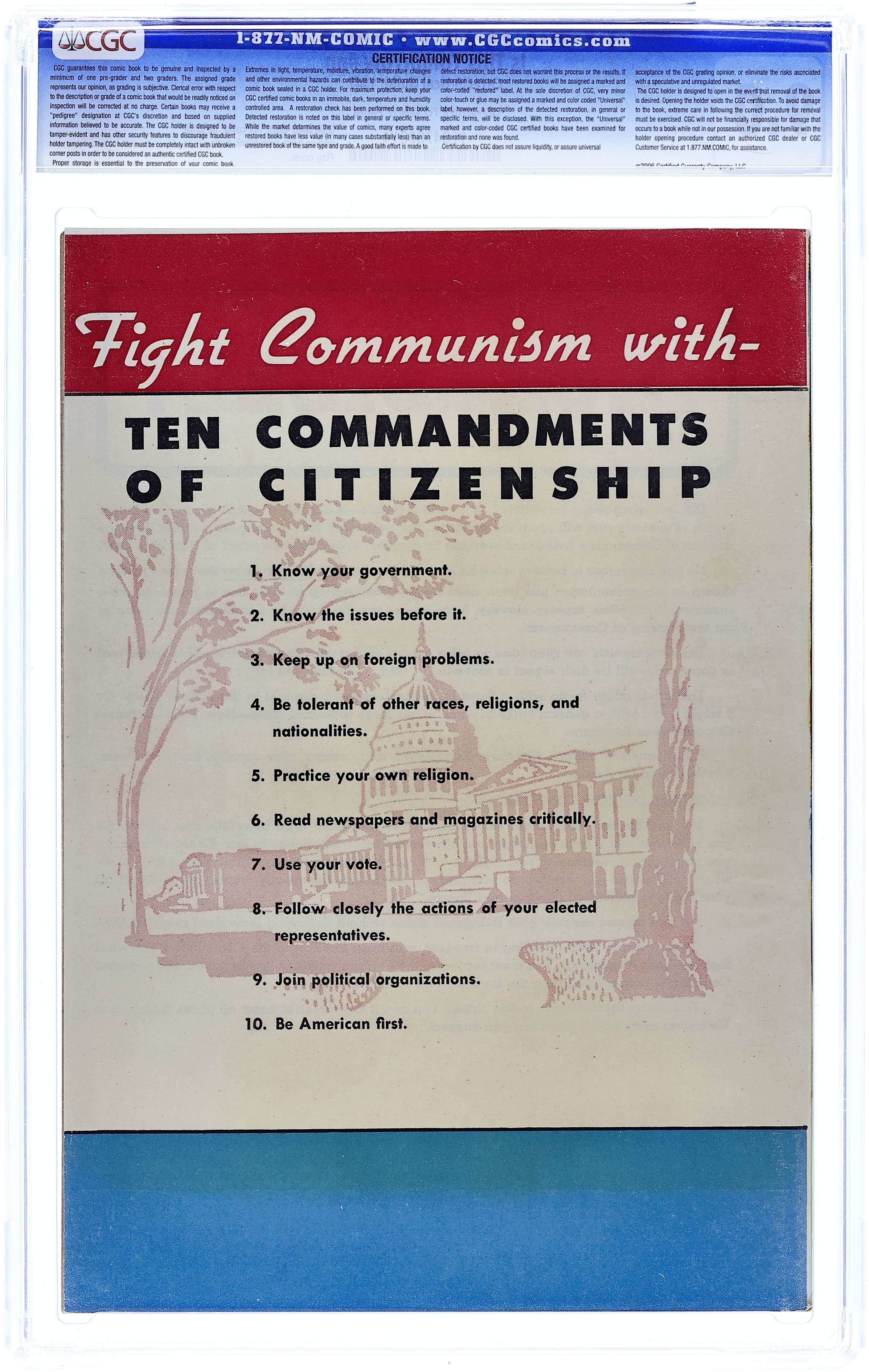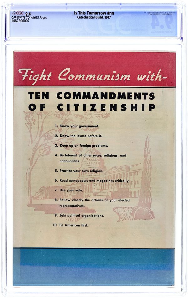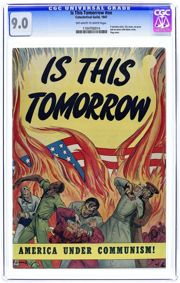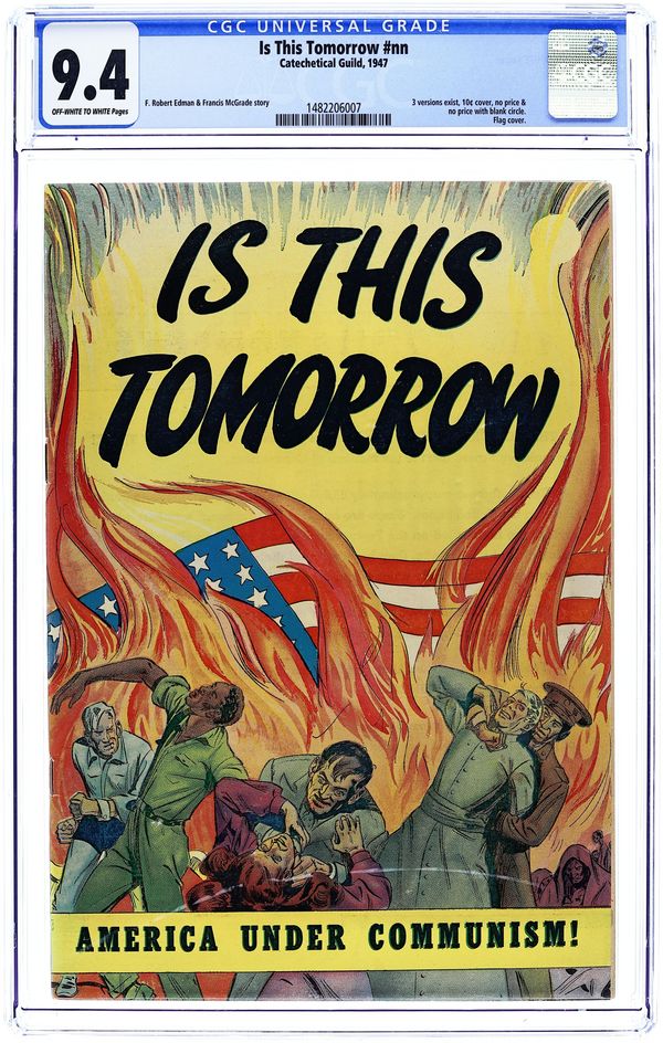 Blank circle with no price on cover. Is This Tomorrow - Written by F. Robert Edman and Francis McGrade. Art by Charles M. Schulz (of Peanuts fame) and unknown. A polemic warning of a future subversive revolution by American communists under orders from the Soviet Union. Plus: 1-page editorial "To Make You Think" on inside front cover; 1-page article "Incredible?" on inside back cover; and "Fight Communism with - Ten Commandments of Citizenship" on back cover.