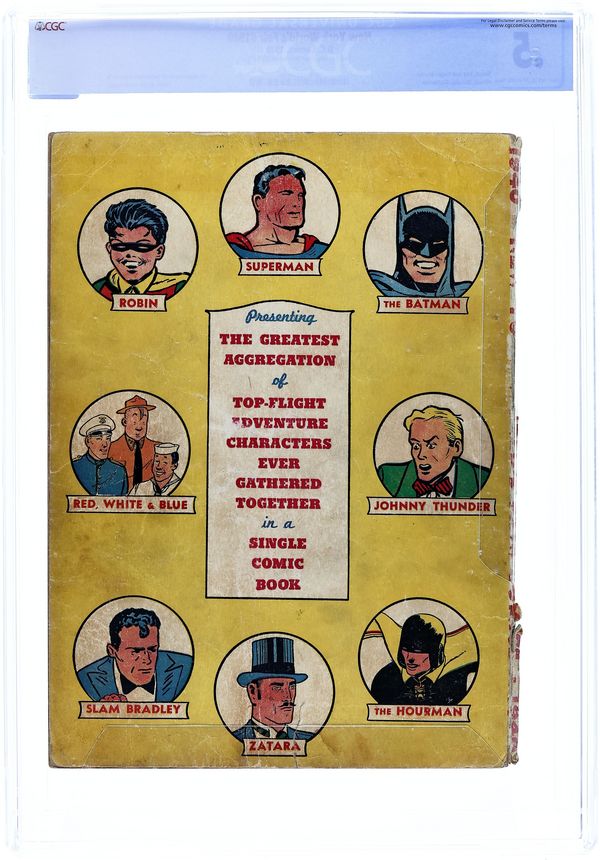 Siegel, Fox and Ginger stories, Flessel, Burnley, Gustavson, and Kane art, Jack Burnley cover. Batman, Robin, Superman, Sandman, Slam Bradly, Johnny Thunder, and Zatara appearance. Last issue. Cover price $0.15.