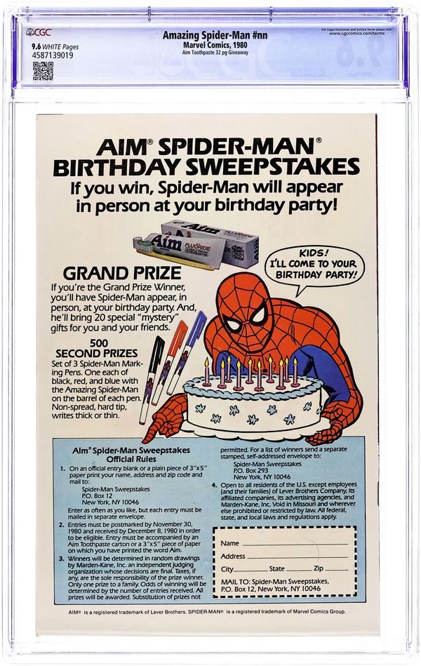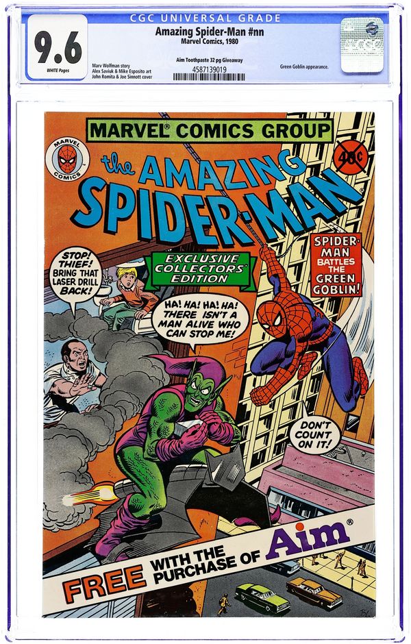 Spidey vs. Green Goblin. Promotional comic issued in 1980 by Aim Toothpaste. Story by Marv Wolfman. Art by Alex Saviuk and Mike Esposito. Cover price $0.40.