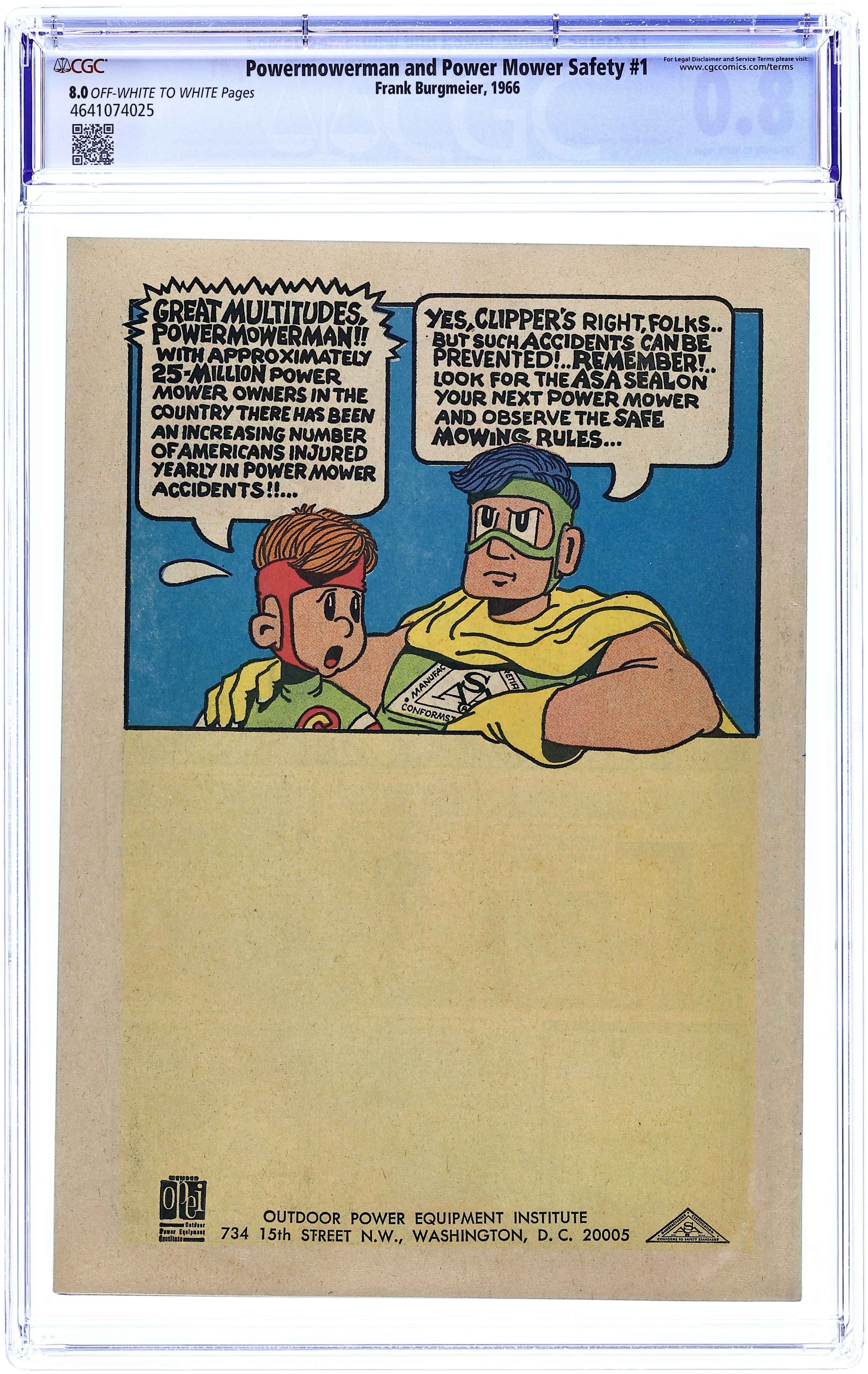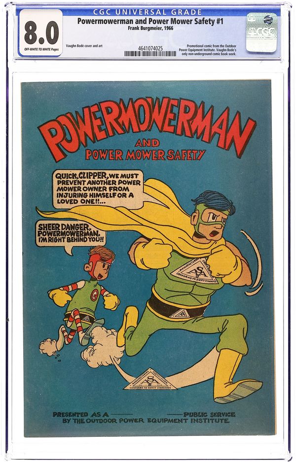 1st Printing. Promotional Comic produced by Outdoor Power Equipment Institute & Frank Burgmeier Co. No date given, not numbered. (W/A) Vaughn Bode. "Powermowerman to the Rescue" Will Powermowerman and his sidekick, Clipper, halt the evil demon Scamp's evil plot to crush power mower safety? 7" x 10", full color, 16 pages, all newsprint.