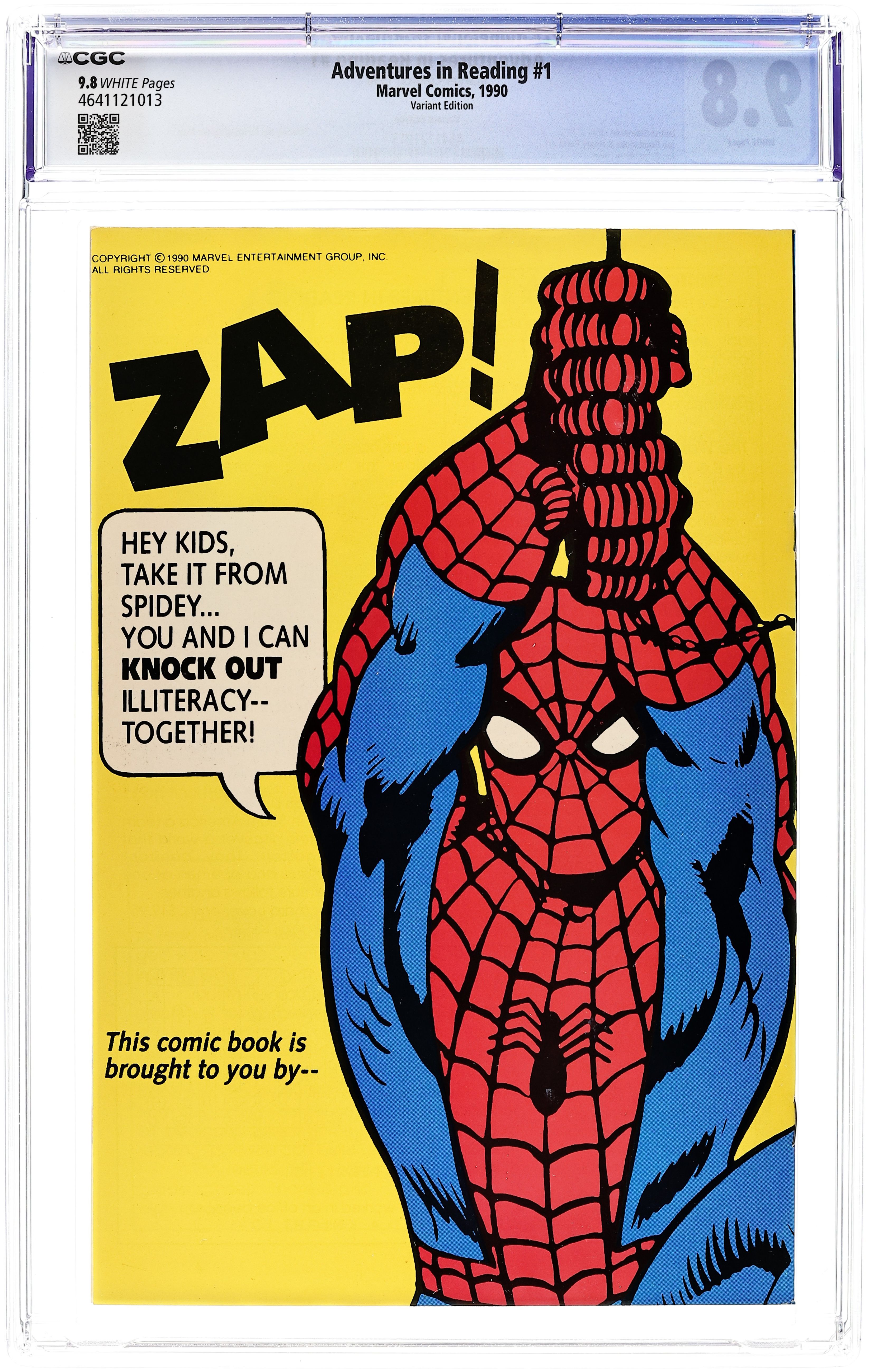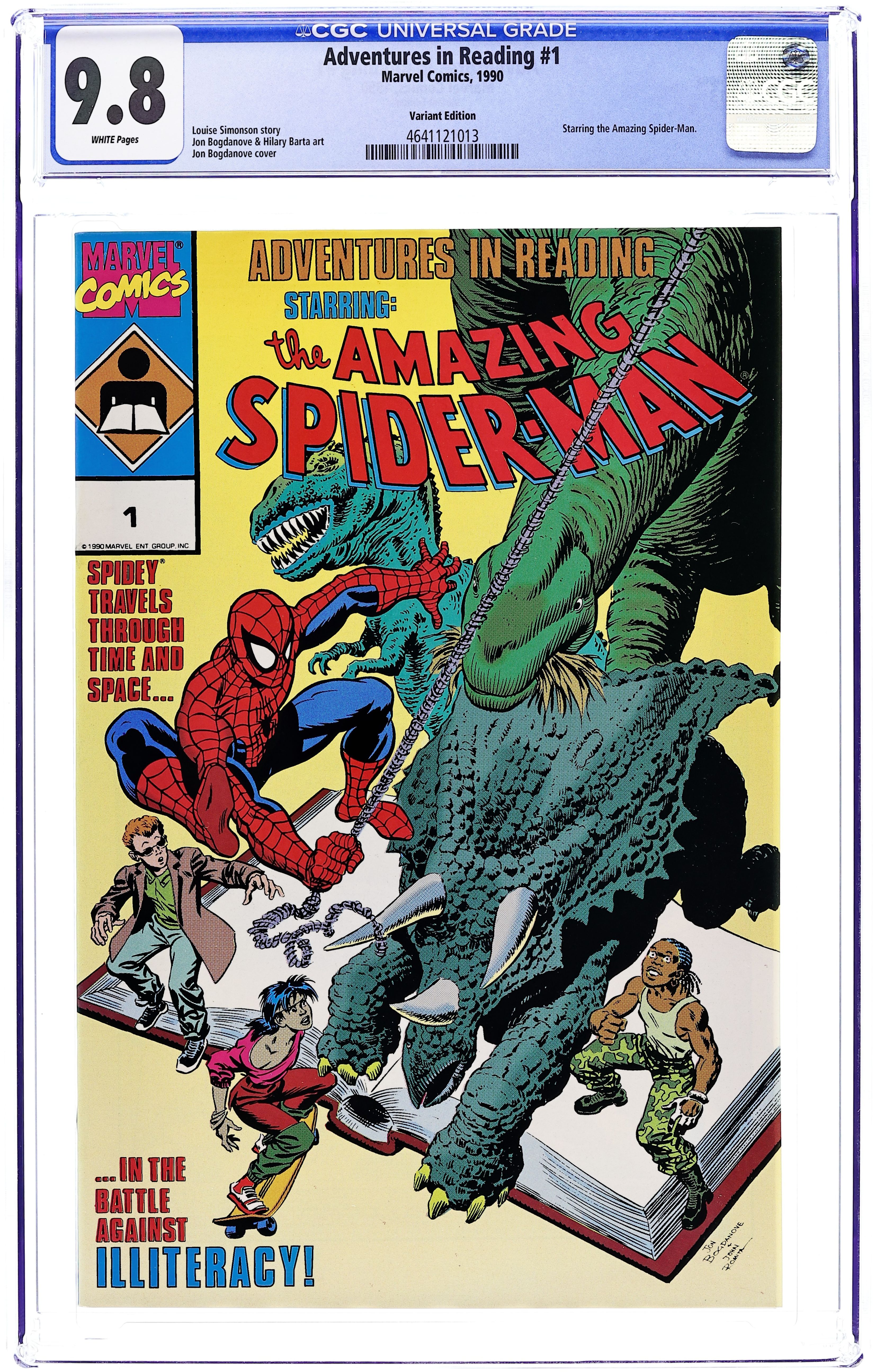 1st Printing (Yellow background back cover). Vol 1 No 1 1990. Giant book laying open with people and dinos around. Amazing Spider-Man Adventures in Reading Giveaway (1990) was published by Marvel to promote literacy. Introduction by Barbara Bush. Written by Louise Simonson, with art by Jon Bogdanove and inks by Hilary Barta. Standard size comic, 36-pages, full color, no cover price.