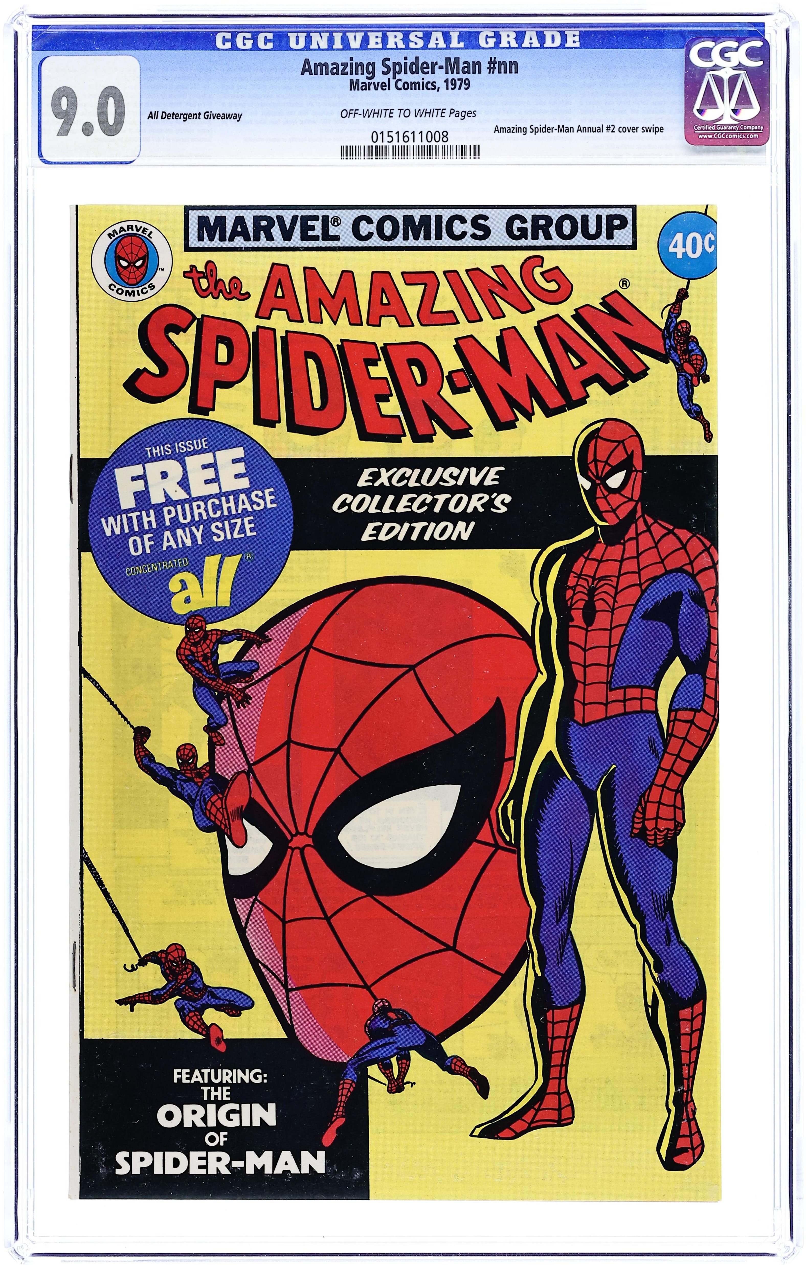 All Detergent giveaway from 1979. Reprints "The Origin of Spider-Man!" written by Stan Lee with art by John Romita and inks by Sal Buscema. Also reprints "Where Flies the Beetle...!" guest-starring the Human Torch, written by Stan Lee, with cool Steve Ditko art and inks. But there is MORE--the secrets of Spidy's spidy-senses, his mask, and his costume. Although this was a giveaway comic, it bears a 40c cover price. Comic-sized, 36-pages, full color. Cover price $0.40.