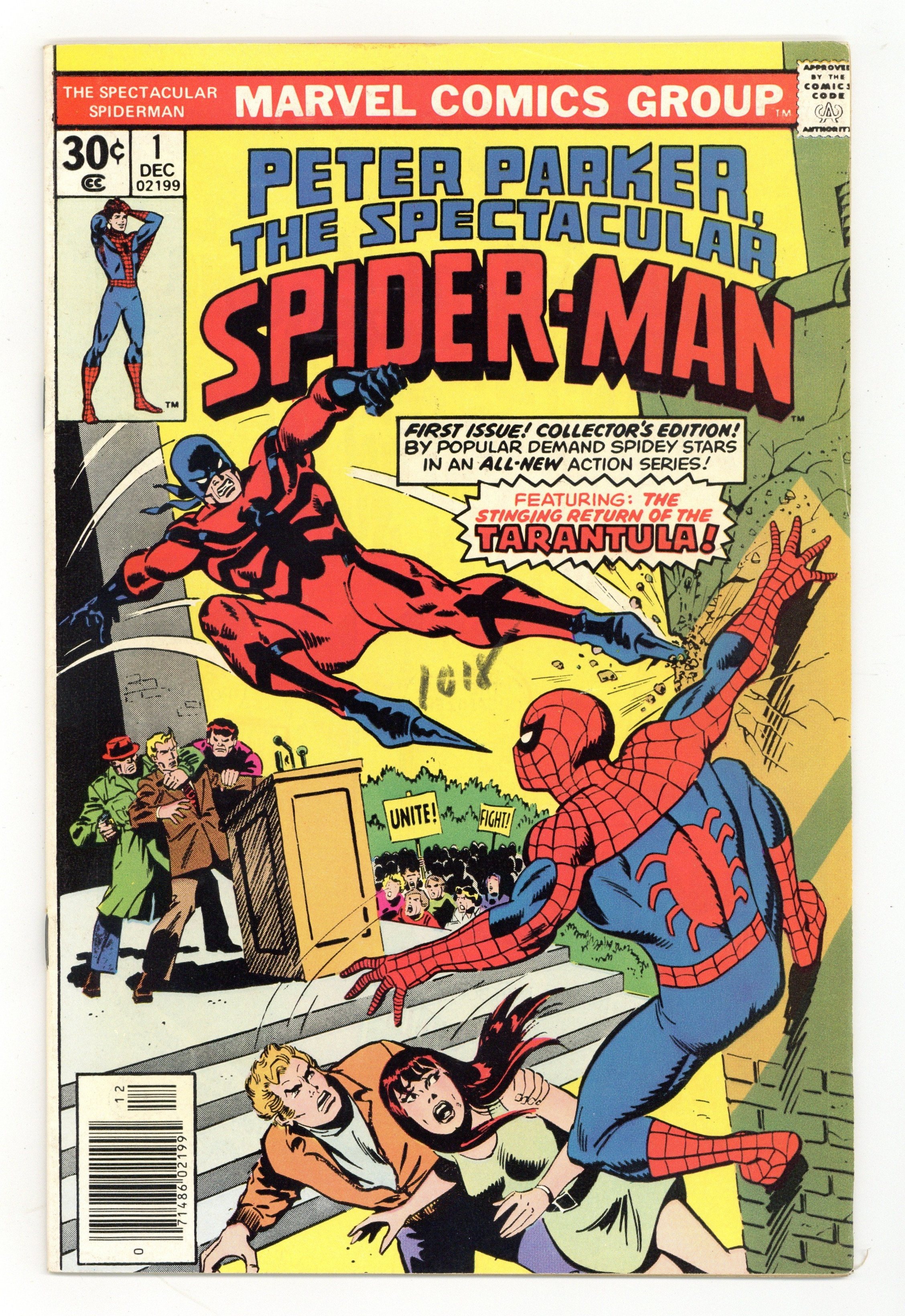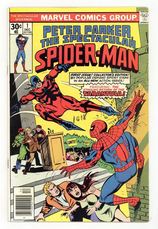 Starts Jan 19 "Twice Stings The Tarantula!" Part 1 of 3. Script by Gerry Conway. Pencils by Sal Buscema. Inks by Mike Esposito. Cover by Sal Buscema and John Romita. The first issue of a brand new series for Spider-Man! The story opens with a bang as the Tarantula kidnaps the Empire State University vice-chancellor, despite the best efforts of the web-slinger, Flash Thompson, and Mary Jane Watson! Next, the Tarantula tries to kill the mayor, but this time the Spectacular Spider-Man is ready! Can the wall-crawler beat the Tarantula and save Mayor Abe Beame? First appearance of Edward Lansky (aka Lightmaster). (Notes: The Spectacular Spider-Man series became the third monthly title for Spider-Man. The first issue of the series debuted the same month as Amazing Spider-Man 163 and Marvel Team-Up 52. The letters page contains an essay from Gerry Conway describing the plans for the new Spider-Man title.) 32 pages Cover price $0.30.