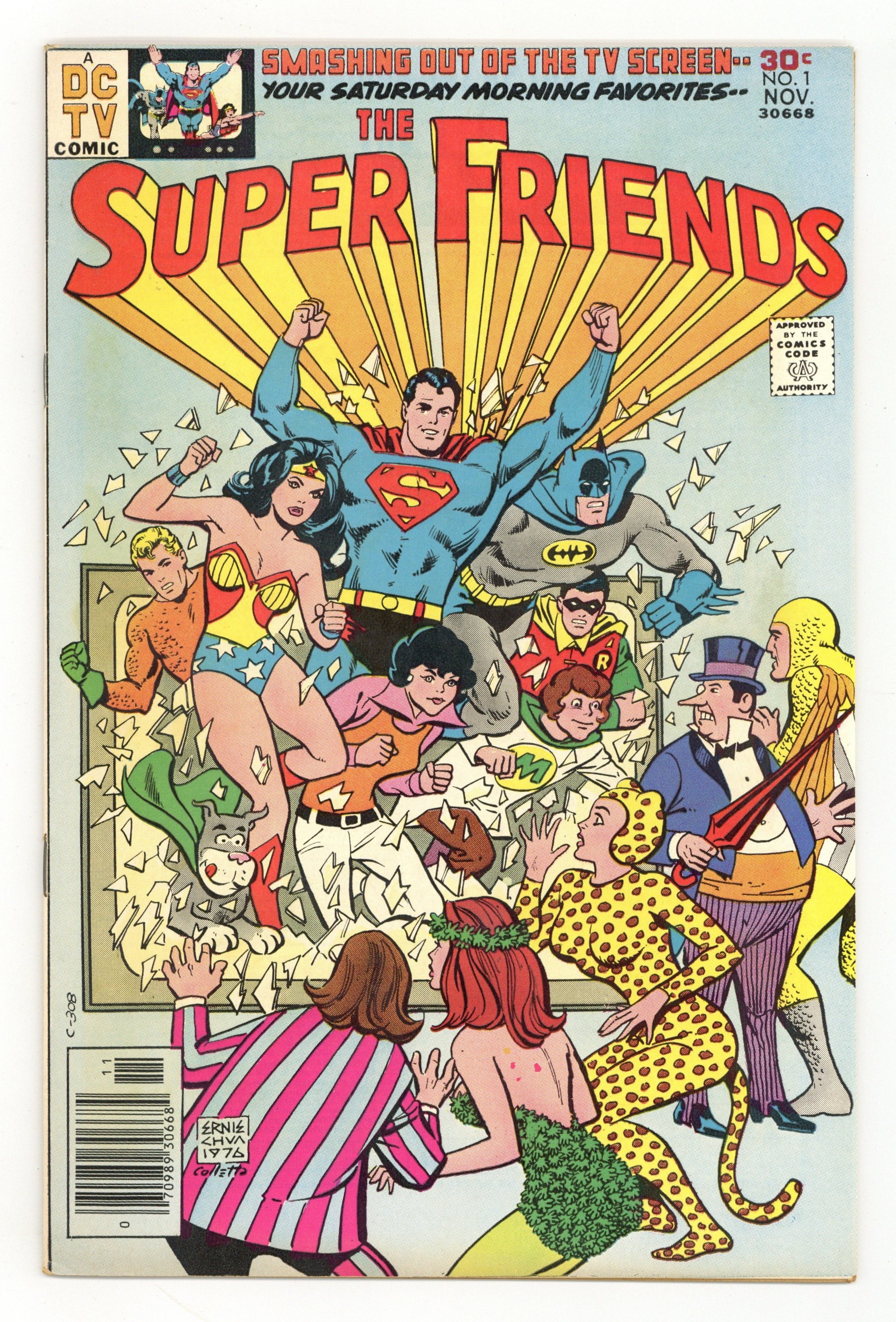 Starts Feb 9 "The Fury of the Super Foes." Aquaman, Batman, Robin, Superman and Wonder Woman attempt to prevent Penguin, Poison Ivy, Cheetah, and others from stealing the components of a super robot. The Super Friends, which are essentially a watered down version of the Justice League, appeared in the Saturday morning animated series of the same name. Script by E. Nelson Bridwell, pencils by Ric Estrada and Joe Orlando, inks by Vince Colletta. Cover by Ernie Chua. Cover price $0.30.