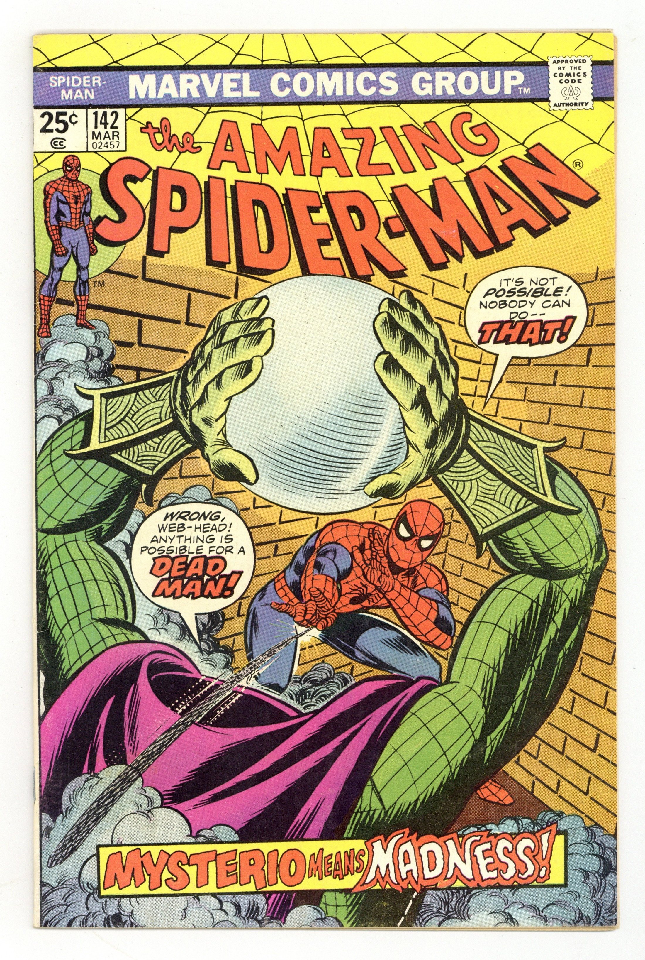 Starts Jan 26 First appearance of the second Mysterio (aka Danny Berkhart) in "The Man's Name Appears to Be...Mysterio!" Part 1 of 2. Script by Gerry Conway. Pencils by Ross Andru. Inks by Frank Giacoia and Dave Hunt (backgrounds). Cover by John Romita. The Amazing Spider-Man decides to take the Spider-Mobile for a spin! But after evading New York's Finest, he accidentally crashes into the Hudson River! Scratch one Spider-Mobile! The mist and fog tricked the web-slinger! The next day when the wall-crawler sees apparitions on his deadly foes including the Green Goblin, Dr. Octopus, and the Molten Man; he realizes that the Master of Illusion has returned! Can Spider-Man stop the madness...before he goes mad himself? Cameo appearances by Mary Jane Watson, Betty Brant, Ned Leeds, Joe Robertson, J. Jonah Jameson, and Professor Miles Warren. (Notes: The web-slinger previously battled the original Mysterio in Amazing Spider-Man 67. The letters page includes Marvel Value Stamp series A #35 Killraven by Herb Trimpe and Frank Giacoia. This story was reprinted in Marvel Tales 118.) 36 pages. 25c cover price. Cover price $0.25.