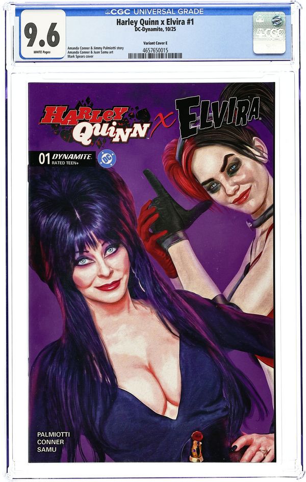 (W) Amanda Conner, Jimmy Palmiotti (A) Amanda Conner, Juan Samu (CA) Mark Spears THE MISTRESS OF THE DARK MEETS DADDY'S LITTLE MONSTER! What happens when the Clown Princess of Crime gets bored? Shenanigans, hijinks, grievous bodily harm… the possibilities are endless! Now add in a certain macabre-minded TV host who seems to attract trouble like crypts attract vampires, and the stage is set for the greatest team-up since Frankenstein met his Bride! With her beloved show on the chopping block following a corporate takeover, Elvira needs to come up with a plan to get things back in the black - and her new friend Harley Quinn has an idea that's just crazy enough to work! Together, they're going to throw the greatest Halloween party Brooklyn has ever seen - whether the borough likes it or not! Written by AMANDA CONNER and JIMMY PALMIOTTI - the world-famous tag-team of all things Harley Quinn - this crossover event for the ages from Dynamite and DC Comics also showcases Amanda's fan-favorite artistic chops, with each issue featuring two (count 'em, two) Conner covers. And that's not all (certainly not!) - she's also joining interior artist (and Elvira favorite) JUAN SAMU to provide selected story pages for the series! But wait, there's more! This premier issue also includes darkly captivating covers from JOSEPH MICHAEL LINSNER, CHAD HARDIN, BEN CALDWELL, and best-selling Mark Spears Monsters creator MARK SPEARS! 32 pages, full color, teen+. Cover price $4.99.