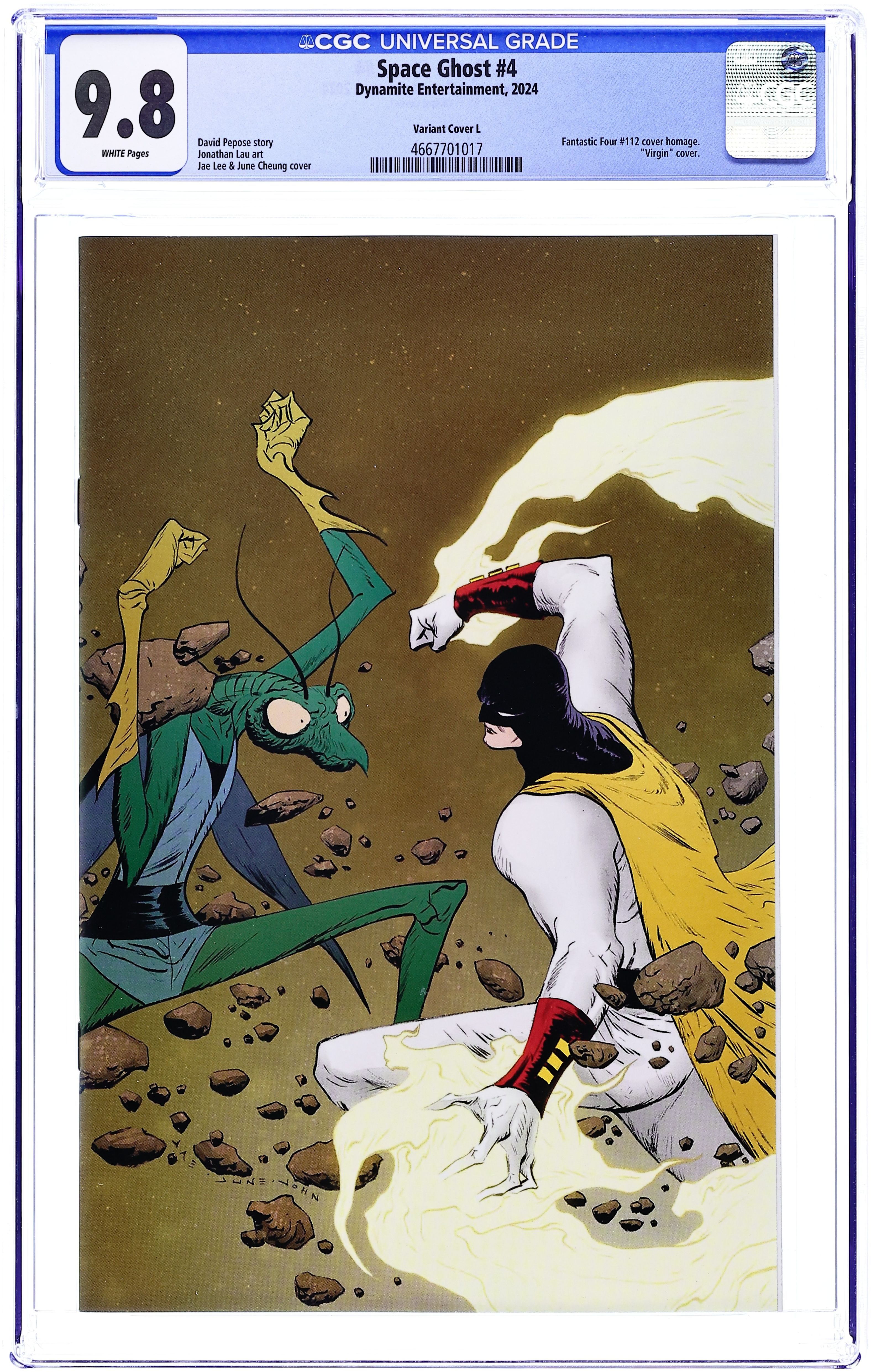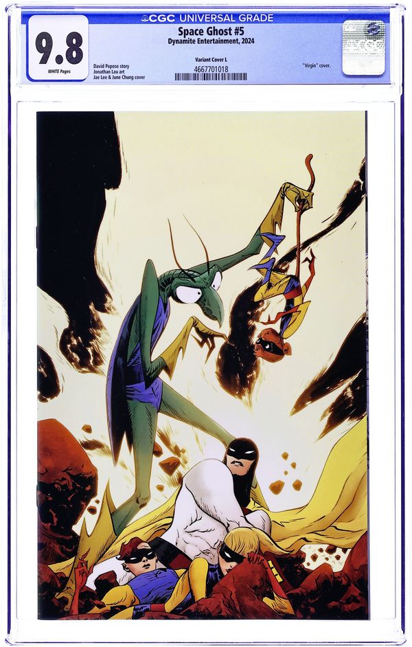 Limited 1 for 40 Retailer Incentive Variant Cover. Written by David Pepose. Art by Jonathan Lau. Cover by Jae Lee, June Chung. 'Today marks the new dawn of the Devourer… All hail the Locust of the Apocalypse!' Space Ghost, Jan, Jace and Blip face the horror that is Zorak and the Cult of Lokar in this action-packed issue! With Zorak seizing the upper hand, Space Ghost is faced with an impossible battle… and one which has a shocking ending that will stay with the good guys for a long, long time to come! Be there! Written by David (Punisher) Pepose and drawn by Dynamite superstar Jonathan Lau, issue #1 features an array of the most incredible artists in the known Galaxy: Bjorn Barends, Francesco Mattina, Jae Lee and Michael Cho! ALL COVERS CARDSTOCK 32 pages, full color. Rated T Cover price $4.99.