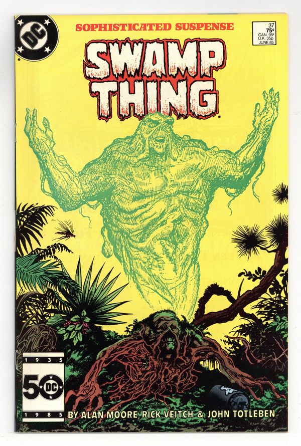 Starts Apr 4 Newsstand Edition. "Growth Patterns!" Written by Alan Moore, with art by Rick Veitch and John Totleben. Cover by Stephen Bissette and Totleben. New "Growth Patterns" and other strange abilities emerge in Swamp Thing as he fights for survival. NOTE: 1st appearance of John Constantine, Hellblazer. 36 pages, full color. Cover price $0.75.