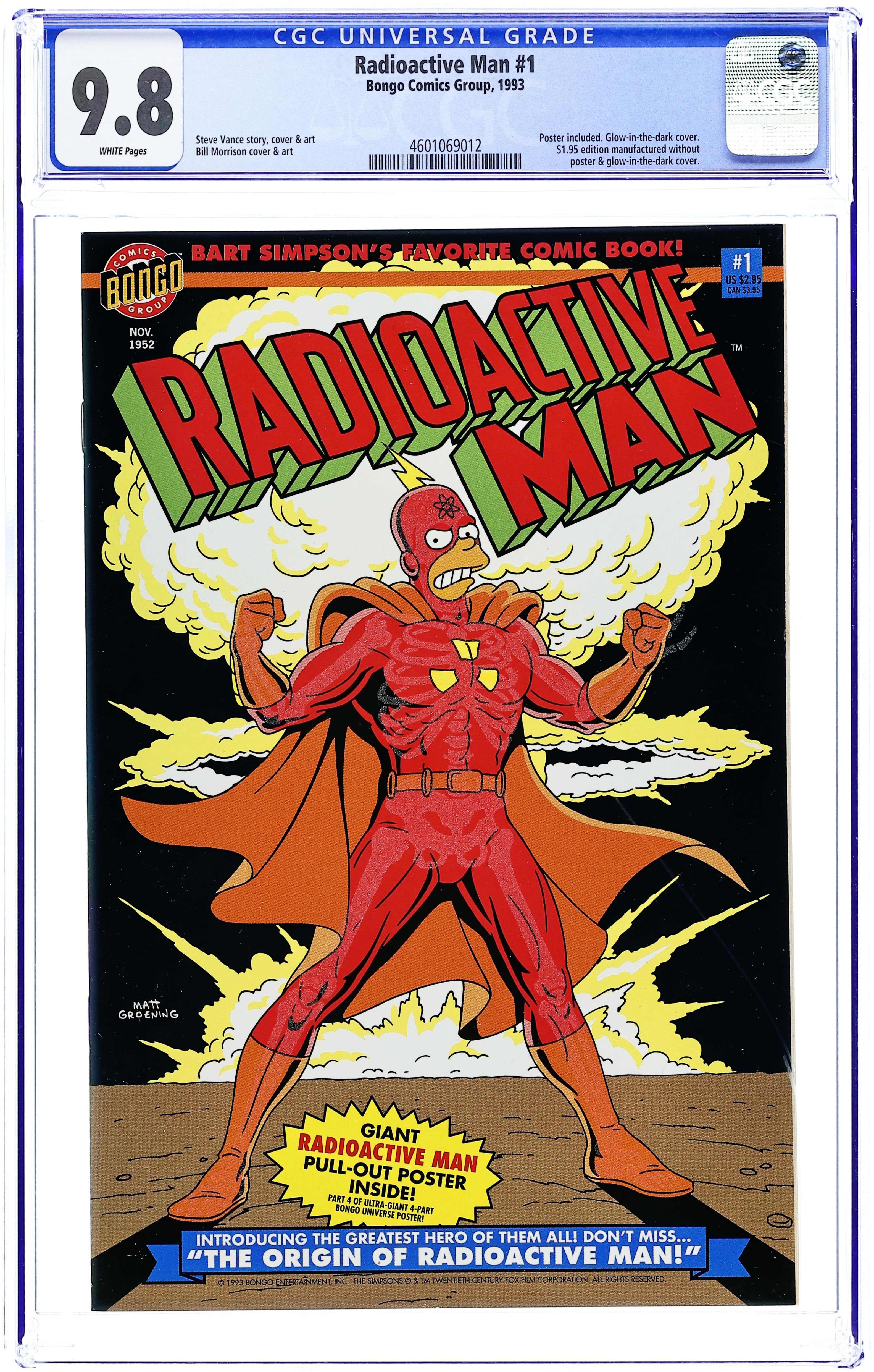 Ends Apr 16 8:54 PM CST Bid History no bids Minimum Bid $1 Your Secret Max Bid If you'd like to bid, please log in or register. Glow in the dark cover, pencils by Steve Vance, inks by Bill Morrison. #1 has a May, 1952 cover date (although the comic was actually published in 1994). Homer Simpson of the Simpsons as Radioactive Man! The Origin of Radioactive Man, script by Cindy Vance (Plot) and Steve Vance (Plot & Script), pencils by Steve Vance (Layout) and Bill Morrison (Finishes), inks by Bill Morrison. Dr. Crab's Commie Comics, script by Cindy Vance (Plot) and Steve Vance (Plot & Script), pencils by Steve Vance (Layout) and Bill Morrison (Finishes), inks by Bill Morrison; Abandoned Warehouse District; Atom Smasher Ray; CCCP [Cartoon Conduct Code Program]; comics [Hartley; Crime Does Pay; Finger's House of Giant Props; Gloria Grand Show; Gold Record; Headlight; Lurid; Mount Zenith; Smart Mouth Comics]; Soviets; Stab Comics; Tales of Revolting Filth; the Containment Dome; the Geodesic Dome; US Congress; Vile; WZEN; Zenith Seafood Service. Jumbo poster insert. 36 pgs. $2.95. Cover price $2.95.