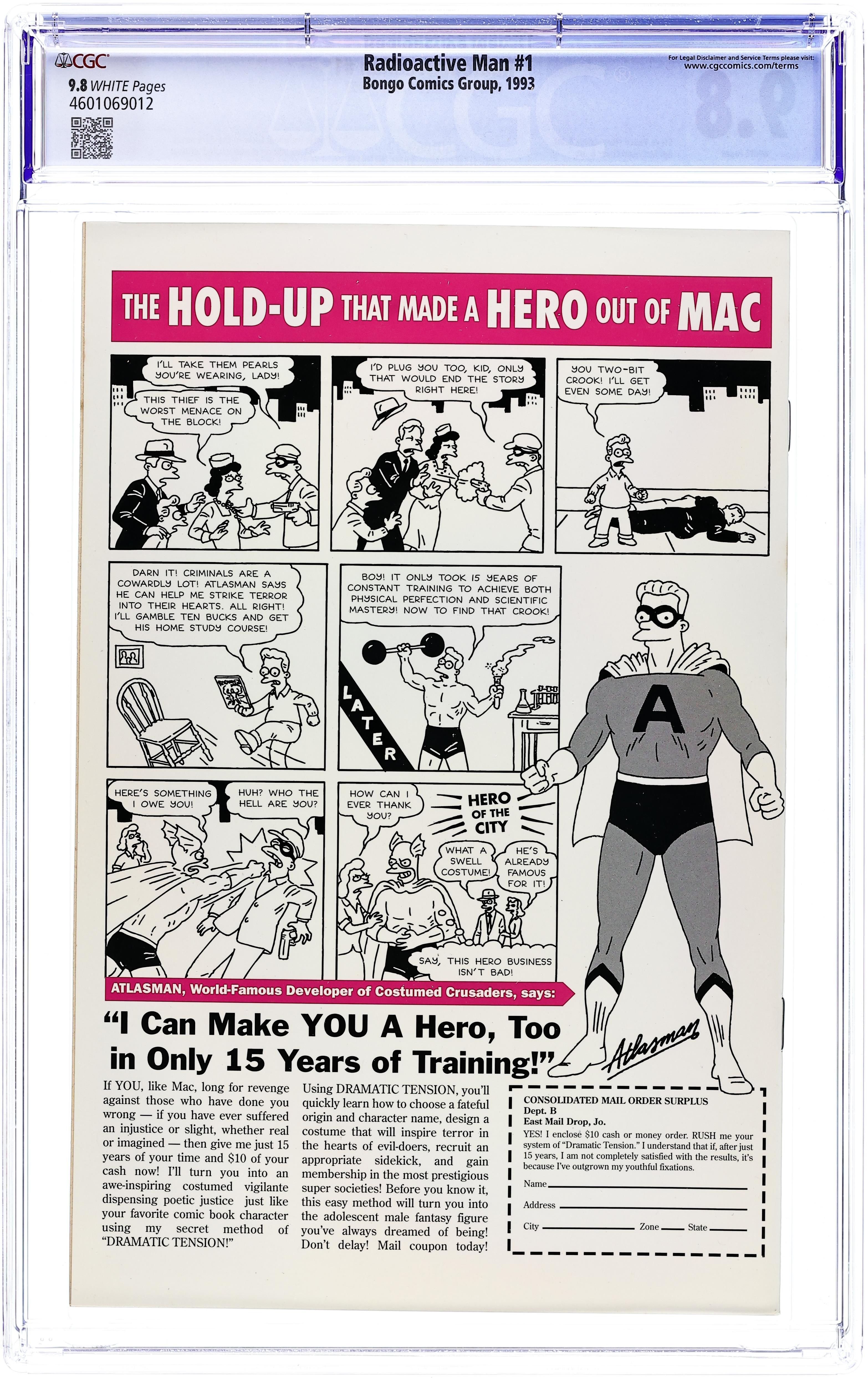 Glow in the dark cover, pencils by Steve Vance, inks by Bill Morrison. #1 has a May, 1952 cover date (although the comic was actually published in 1994). Homer Simpson of the Simpsons as Radioactive Man! The Origin of Radioactive Man, script by Cindy Vance (Plot) and Steve Vance (Plot & Script), pencils by Steve Vance (Layout) and Bill Morrison (Finishes), inks by Bill Morrison. Dr. Crab's Commie Comics, script by Cindy Vance (Plot) and Steve Vance (Plot & Script), pencils by Steve Vance (Layout) and Bill Morrison (Finishes), inks by Bill Morrison; Abandoned Warehouse District; Atom Smasher Ray; CCCP [Cartoon Conduct Code Program]; comics [Hartley; Crime Does Pay; Finger's House of Giant Props; Gloria Grand Show; Gold Record; Headlight; Lurid; Mount Zenith; Smart Mouth Comics]; Soviets; Stab Comics; Tales of Revolting Filth; the Containment Dome; the Geodesic Dome; US Congress; Vile; WZEN; Zenith Seafood Service. Jumbo poster insert. 36 pgs. $2.95. Cover price $2.95.