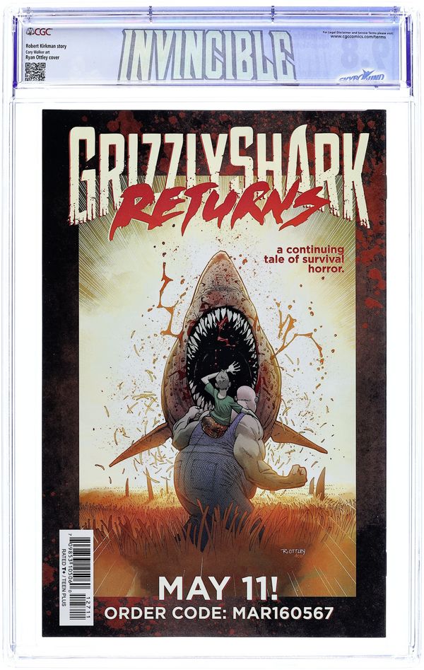 Written by Robert Kirkman. Art by Cory Walker and Nathan Fairbairn. Cover by Ryan Ottley and Jean-Francois Beaulieu. Thragg is making moves, conquering more worlds as he rebuilds the Viltrum Empire. Meanwhile, Mark, Eve, and Terra take a trip to Earth to visit Grandma and Grandpa. 20 pages, full color. Rated T+ Cover price $2.99.