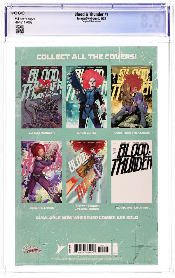 JScottCampbell.Com Exclusive Foil Edition Variant Cover by J. Scott Campbell. Written by Benito Cereno. Art by E.J. Su, Msassyk. Cover by J. Scott Campbell, Tanya Lehoux. SERIES PREMIERE Bounty hunter Akeldama Blood Bledsoe and her cantankerous talking gun Thunder are the best out there at bringing in the bad guys. However, when the galaxys most dangerous criminal breaks out of prison, Bloods hunt delivers her down a path that will unlock secrets about her past, present, and future...and thats when things get REALLY BAD. The team of BENITO CERENO, E.J. SU (TECH JACKET), and MICHELE MSASSYK ASSARASAKORN, in partnership with visionary creator** ROBERT KIRKMAN** (INVINCIBLE, THE WALKING DEAD), present an all-new action epic set in the near future where Earth has integrated alien species into a new society—meaning theres a whole new set of rules...and a whole load of new crimes to solve. 28 pages, full color. Rated M Cover price $3.99.