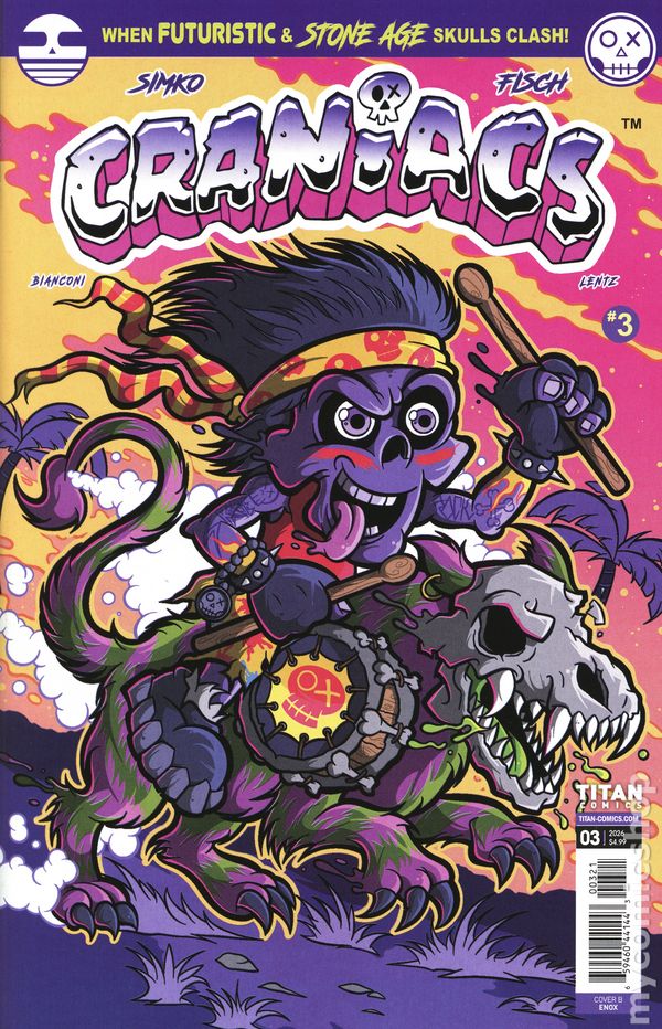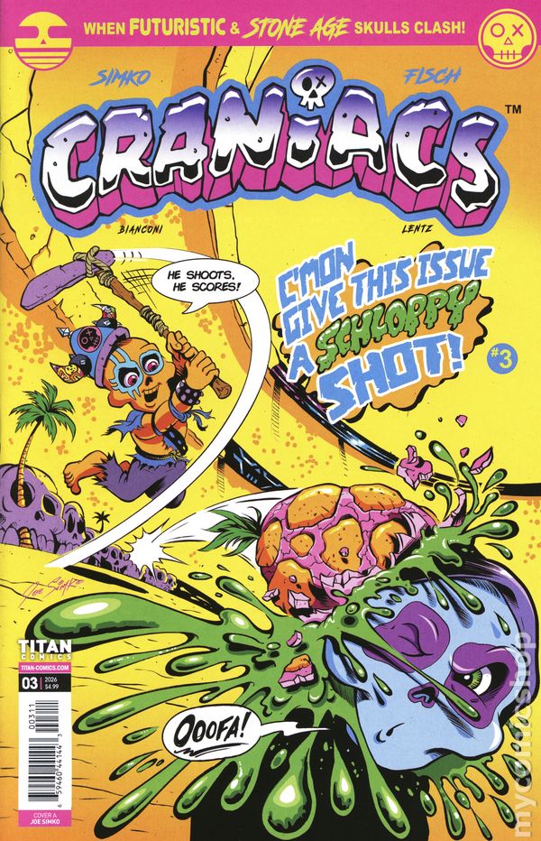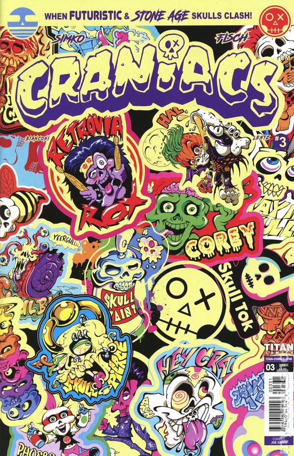 (W) Sholly Fisch (A) Joe Simko (CA) Joe Simko Debut comic based on the hit Craniacs trading cards created by lead Garbage Pail Kids card artist Joe Simko and Topps senior executive Ira Friedman! Craniacs TV series in active development from animation studio Titmouse (Spider-Man: Across the Spider-Verse)! Written by Sholly Fisch (Batman, Superman, Scooby-Doo), with stunning artwork by Garbage Pail Kids artist Joe Simko. Two planets collide forming one world. Two distinct skull-faced societies split down the middle. One side is wild & stone age named RETROVIA; the other side is systematic & ultra-futuristIc named FUTERRA. Cover price $4.99.