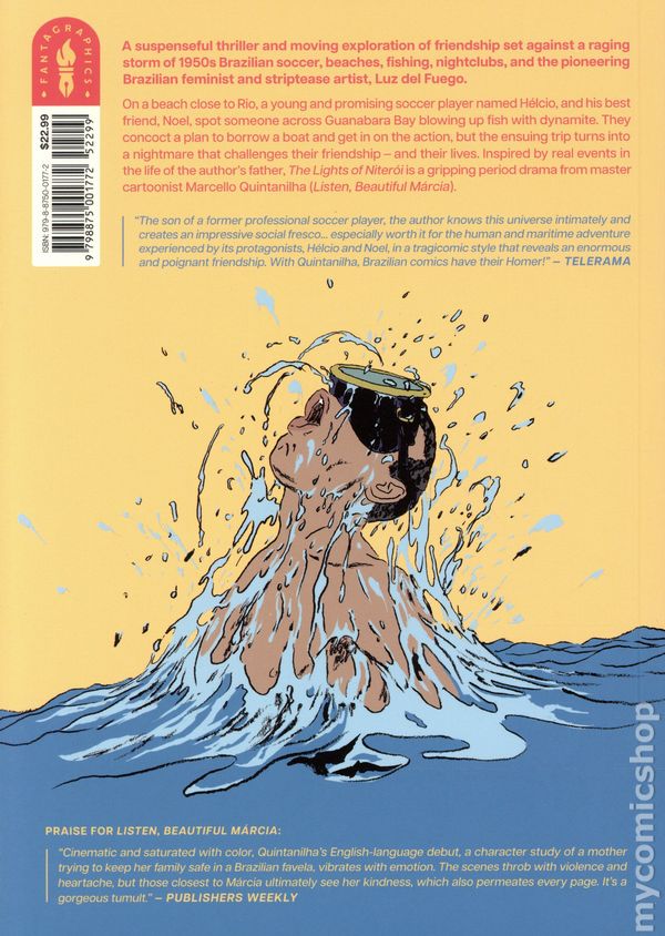 1st printing. Story and art by Marcello Quintanilha. In 1950s Brazil, somewhere by the beach, not far from Rio, Hélcio, a young and promising soccer player, and his friend Noël, spot someone fishing with dynamite. They decide to take a boat and steal some of the dead fish to make some money. The boat trip turns into a perilous journey as the two thieves embark on an adventure that will challenge their friendship. Inspired by the life of Marcello Quintanilhas father, Hélcio Quintanilha, this graphic novel is both a suspenseful thriller and a breathtaking story about friendship. In The Lights of Niteroi, internationally acclaimed graphic novelist Marcello Quintanilha returns to the city where he was born and raised. He dives into the waters of Guanabara Bay and crafts a plot based on real events that took place in the 1950s. Its an adventure full of suspense, involving fishermen, soccer, the Brazilian feminist and striptease artist Luz del Fuego, and the first naturist camp in Brazil. Translated by the author with Bruna Dantas Lobato. Softcover, 6 1/2-in. x 9 1/2-in., 232 pages, full color. Mature Readers Cover price $22.99.