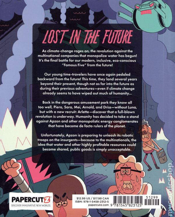 Volume 3 - 1st printing. "Save the Planet!" Written by Daiman. Art and cover by Alex Fuentes. As climate-change rages on, the revolution against the multinational companies that monopolize water has begun! Its the final battle for our modern, inclusive, eco-conscious Famous Five from the future! For fans of adventure and science fiction. Our young time-travelers have once again pedaled backward from the future! This time, they land several years beyond their present, though not as far into the future as during their previous adventures—even if climate change already seems to have wiped out much of humanity... Back in the dangerous amusement park they know all too well, Piero, Sara, Mei, Arnold, and Driss—without Luna, but with a new recruit: Arlette—discover that a full-blown revolution is underway. Humanity has decided to take a stand against Apzon and other monopolistic energy conglomerates that have become de facto rulers of the planet. Unfortunately, Apzon is preparing to unleash its robotic troops on the insurgents—because to the multinationals, the idea that water and other highly profitable resources could become shared, public goods is simply unacceptable. This is the final stand for our modern, inclusive, eco-conscious Famous Five from the future! Softcover, 6-in. x 7-in., 128 pages, full color. Cover price $12.99.